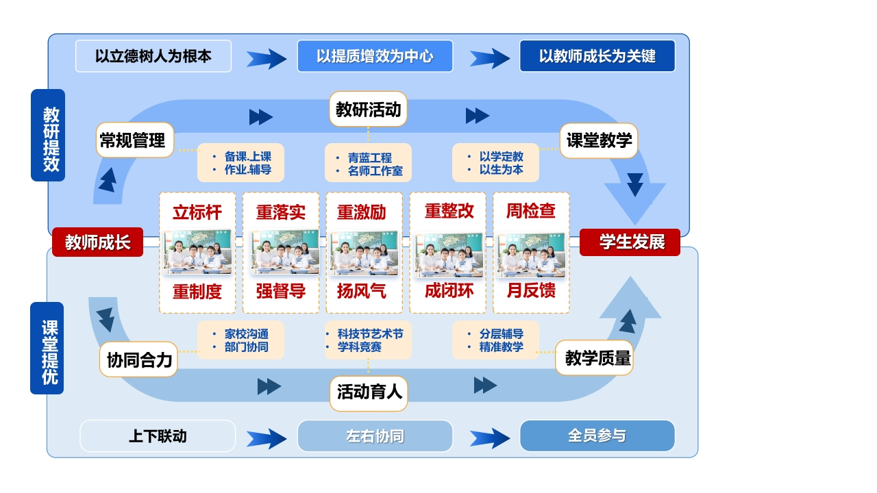 以立德树人为根本→以提质增效为中心以教师成长为关键教研活动教研提效冷常规管理课堂教学备课上课青蓝工程以学定教作业.辅导名师工作室以生为本立标杆重落实重激励重整改周检查教师成长学生发展重制度强督导扬风气成闭环月反馈课堂提优家校沟通科技节艺术节分层辅导部门协同学科竞赛精准教学协同合力教学质量活动育人上下联动→左右协同→全员参与