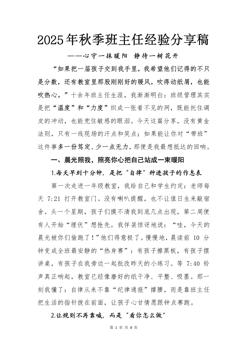 2025年秋季班主任经验分享稿一一心守一抹暖阳静待一树花开“如果把一届孩子交到我手里,我希望他们记得的不只是分数,还有教室里那股刚刚好的暖风,吹得动纸屑,也能吹热心。”十余年班主任生涯,我渐渐明白:班级管理其实是把“温度”和“力度”织成一张看不见的网,既能托住调皮的冲动,也能兜住敏感的眼泪。今天这篇分享,没有黄金法则,只有一线现场的汗点和笑点;如果能让你对“带班”这件事多一份笃定、少一点无力,那便是我最想抵达的回响。一、晨光照我,照亮你心把自己站成一束暖阳1每天早到十分钟,是把“自律”种进孩子的作息表第一次走进一年级教室,我给自己和学生约定:老师每天7:21打开教室门。没有喇叭提醒,也不让值日生来敲宿舍。头一个星期,孩子们摸不清我到底几点出现,第二周便有人开始“埋伏”想抢先。我佯装惊讶地说:“哇,今天的晨光被你们偷跑了!”他们得意极了。慢慢地,晨读前10分钟变成全班最安静的“热身赛”:有孩子擦黑板,有孩子摆讲桌,有孩子在我旁边一起批改昨天的小练习。等7:40铃声真正响起,教室已经像磨好的纸干净、平整、吸墨。那一刻我懂了:自律从来不靠“纪律通报”撑腰,而是靠班主任把生活的指针拨在前面,让孩子心甘情愿跟钟点赛跑。2让规则不再靠喊,而是“看你怎么做”第1页共8页