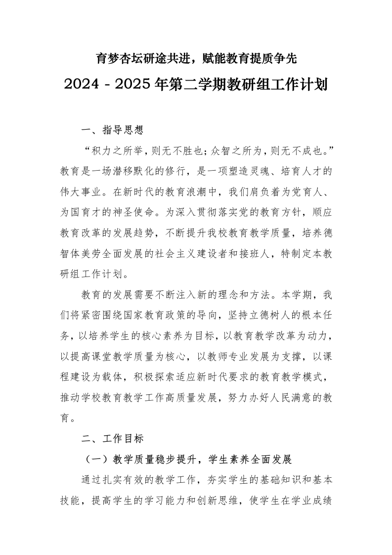 育梦杏坛研途共进,赋能教育提质争先2024-2025年第二学期教研组工作计划一、指导思想“积力之所举,则无不胜也;众智之所为,则无不成也。”教育是一场潜移默化的修行,是一项塑造灵魂、培育人才的伟大事业。在新时代的教育浪潮中,我们肩负着为党育人、为国育才的神圣使命。为深入贯彻落实党的教育方针,顺应教育改革的发展趋势,不断提升我校教育教学质量,培养德智体美劳全面发展的社会主义建设者和接班人,特制定本教研组工作计划。教育的发展需要不断注入新的理念和方法。本学期,我们将紧密围绕国家教育政策的导向,坚持立德树人的根本任务,以培养学生的核心素养为目标,以教育教学改革为动力,以提高课堂教学质量为核心,以教师专业发展为支撑,以课程建设为载体,积极探索适应新时代要求的教育教学模式,推动学校教育教学工作高质量发展,努力办好人民满意的教育。二、工作目标(一)教学质量稳步提升,学生素养全面发展通过扎实有效的教学工作,夯实学生的基础知识和基本技能,提高学生的学习能力和创新思维,使学生在学业成绩