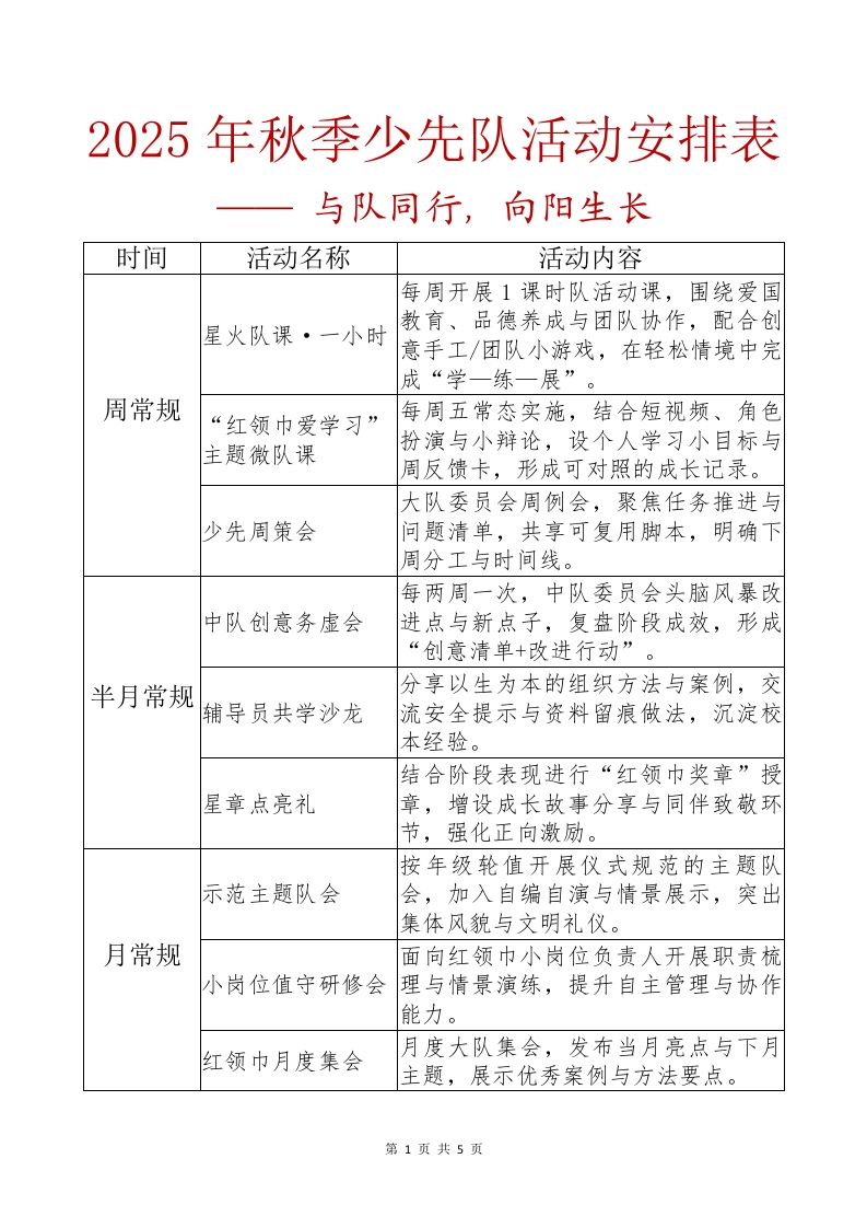 2025年秋季少先队活动安排表与队同行,向阳生长时间活动名称活动内容每周开展1课时队活动课,围绕爱国星火队课·一小时教育、品德养成与团队协作,配合创意手工/团队小游戏,在轻松情境中完成“学一练一展”。周常规“红领巾爱学习”每周五常态实施,结合短视频、角色主题微队课扮演与小辩论,设个人学习小目标与周反馈卡,形成可对照的成长记录。大队委员会周例会,聚焦任务推进与少先周策会问题清单,共享可复用脚本,明确下周分工与时间线。每两周一次,中队委员会头脑风暴改中队创意务虚会进点与新点子,复盘阶段成效,形成“创意清单+改进行动”。半月常规分享以生为本的组织方法与案例,交辅导员共学沙龙流安全提示与资料留痕做法,沉淀校本经验。结合阶段表现进行“红领巾奖章”授星章点亮礼章,增设成长故事分享与同伴致敬环节,强化正向激励。按年级轮值开展仪式规范的主题队示范主题队会会,加入自编自演与情景展示,突出集体风貌与文明礼仪。月常规面向红领巾小岗位负责人开展职责梳小岗位值守研修会理与情景演练,提升自主管理与协作能力。红领巾月度集会月度大队集会,发布当月亮点与下月主题,展示优秀案例与方法要点。第1页共5页