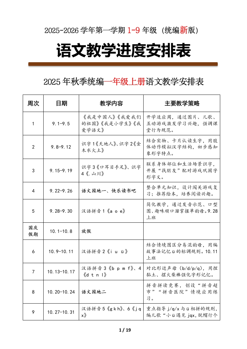 2025-2026学年第一学期1-9年级(统编新版)语文教学进度安排表2025年秋季统编一年级上册语文教学安排表周次日期教学内容主要教学策略《我是中国人》《我爱我们开学适应周,通过图片、儿歌、19.1-9.5的祖国》《我是小学生》《我互动游戏激发学习兴趣,强调课爱学语文》堂行为规范。结合实物、卡片认读生字,用肢29.8-9.12识字1《天地人》、识字2《金体动作模拟汉字结构,初步感知木水火土》象形字特点。识字3《口耳目手足》、识字联系身体部位和生活场景识字,39.15-9.194《.山川》开展“找朋友”配对游戏巩固字形字义。×9.22-9.26语文园地一、快乐读书吧整合单元知识,设计闯关游戏复习:推荐绘本,培养阅读兴趣。简化教学,通过发音示范、口型59.28-9.30汉语拼音1《aoe》图、趣味顺口溜掌握单韵母。9.28上班国庆10.1-10.8放假假期结合情境图区分易混韵母,用编610.9-10.11汉语拼音2《iu0》故事法记忆0的标调规则。10.11上班汉语拼音3《bpmf》、4对比形近声母(b/d/p/q),用捏710.13-10.17《dtnI》黏土、摆火柴棒强化字形记忆。拼音拼读竞赛,创设“拼音超810.20-10.24语文园地二市”“拼音医院”情境应用练习。汉语拼音5《gkh》、6《jq重点指导j/q/x与ǖ相拼的规则,910.27-10.31x》编儿歌“小U遇见jq×,脱帽行个1/19