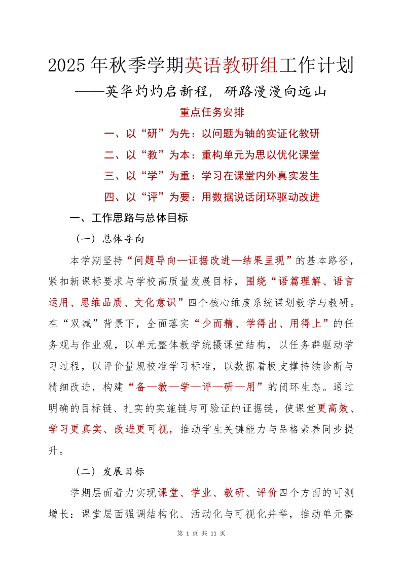 2025年秋季学期英语教研组工作计划一英华灼灼启新程,研路漫漫向远山重点任务安排一、以“研”为先:以问题为轴的实证化教研二、以“教”为本:重构单元为思以优化课堂三、以“学”为重:学习在课堂内外真实发生四、以“评”为要:用数据说话闭环驱动改进一、工作思路与总体目标(一)总体导向本学期坚持“问题导向一证据改进一结果呈现”的基本路径,紧扣新课标要求与学校高质量发展目标,围绕“语篇理解、语言运用、思维品质、文化意识”四个核心维度系统谋划教学与教研。在“双减”背景下,全面落实“少而精、学得出、用得上”的任务观与作业观,以单元整体教学统摄课堂结构,以任务群驱动学习过程,以评价量规校准学习标准,以数据看板支撑持续诊断与精细改进,构建“备一教一学一评一研一用”的闭环生态。通过明确的目标链、扎实的实施链与可验证的证据链,使课堂更高效、学习更真实、改进更可视,推动学生关键能力与品格素养同步提升。(二)发展目标学期层面着力实现课堂、学业、教研、评价四个方面的可测增长:课堂层面强调结构化、活动化与可视化并举,推动单元整第1页共11页