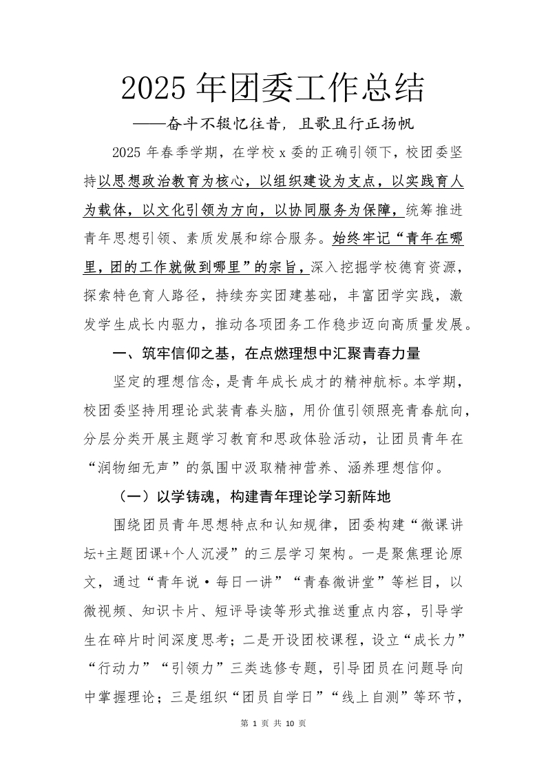 2025年团委工作总结一奋斗不辍忆往昔,且歌且行正扬帆2025年春季学期,在学校x委的正确引领下,校团委坚持以思想政治教育为核心,以组织建设为支点,以实践育人为载体,以文化引领为方向,以协同服务为保障,统筹推进青年思想引领、素质发展和综合服务。始终牢记“青年在哪里,团的工作就做到哪里”的宗旨,深入挖掘学校德育资源,探索特色育人路径,持续夯实团建基础,丰富团学实践,激发学生成长内驱力,推动各项团务工作稳步迈向高质量发展。一、筑牢信仰之基,在点燃理想中汇聚青春力量坚定的理想信念,是青年成长成才的精神航标。本学期,校团委坚持用理论武装青春头脑,用价值引领照亮青春航向,分层分类开展主题学习教育和思政体验活动,让团员青年在“润物细无声”的氛围中汲取精神营养、涵养理想信仰。(一)以学铸魂,构建青年理论学习新阵地围绕团员青年思想特点和认知规律,团委构建“微课讲坛+主题团课+个人沉浸”的三层学习架构。一是聚焦理论原文,通过“青年说·每日一讲”“青春微讲堂”等栏目,以微视频、知识卡片、短评导读等形式推送重点内容,引导学生在碎片时间深度思考;二是开设团校课程,设立“成长力”“行动力”“引领力”三类选修专题,引导团员在问题导向中掌握理论;三是组织“团员自学日”“线上自测”等环节,第1页共10页