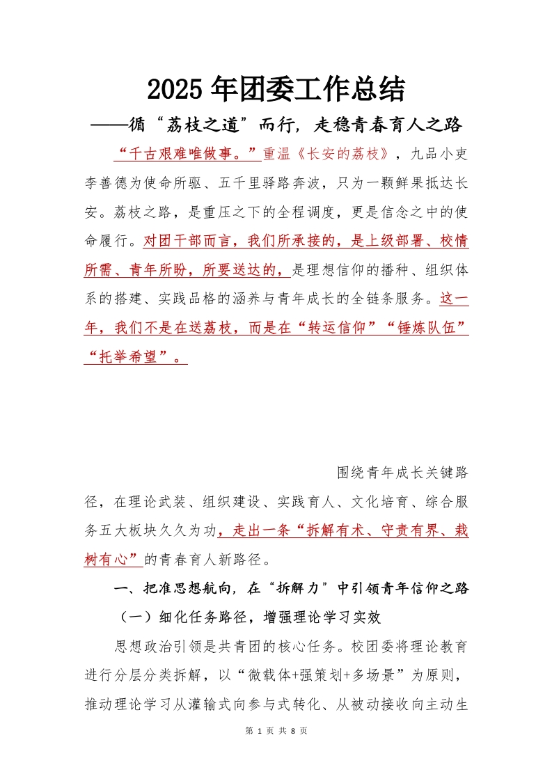 2025年团委工作总结一循“荔枝之道”而行,走稳青春育人之路“千古艰难唯做事。”重温《长安的荔枝》,九品小吏李善德为使命所驱、五千里驿路奔波,只为一颗鲜果抵达长安。荔枝之路,是重压之下的全程调度,更是信念之中的使命履行。对团干部而言,我们所承接的,是上级部署、校情所需、青年所盼,所要送达的,是理想信仰的播种、组织体系的搭建、实践品格的涵养与青年成长的全链条服务。这一年,我们不是在送荔枝,而是在“转运信仰”“锤炼队伍”“托举希望”。围绕青年成长关键路径,在理论武装、组织建设、实践育人、文化培育、综合服务五大板块久久为功,走出一条“拆解有术、守责有界、栽树有心”的青春育人新路径。一、把准思想航向,在“拆解力”中引领青年信仰之路(一)细化任务路径,增强理论学习实效思想政治引领是共青团的核心任务。校团委将理论教育进行分层分类拆解,以“微载体+强策划+多场景”为原则,推动理论学习从灌输式向参与式转化、从被动接收向主动生第1页共8页