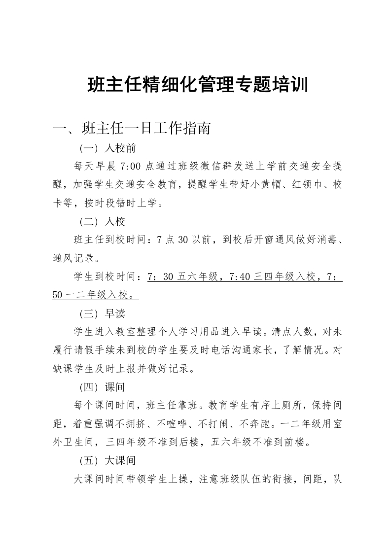 班主任精细化管理专题培训一、班主任一日工作指南(一)入校前每天早晨7:00点通过班级微信群发送上学前交通安全提醒,加强学生交通安全教育,提醒学生带好小黄帽、红领巾、校卡等,按时段错时上学。(二)入校班主任到校时间:7点30以前,到校后开窗通风做好消毒、通风记录。学生到校时间:7:30五六年级,7:40三四年级入校,7:50一二年级入校。(三)早读学生进入教室整理个人学习用品进入早读。清点人数,对未履行请假手续未到校的学生要及时电话沟通家长,了解情况。对缺课学生及时上报并做好记录。(四)课间每个课间时间,班主任靠班。教育学生有序上厕所,保持间距,着重强调不拥挤、不喧哗、不打闹、不奔跑。一二年级用室外卫生间,三四年级不准到后楼,五六年级不准到前楼。(五)大课间大课间时间带领学生上操,注意班级队伍的衔接,间距,队