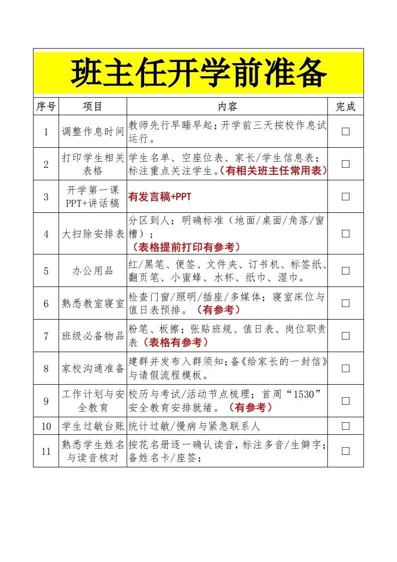 班主任开学前准备序号项目内容完成调整作息时间教师先行早睡早起;开学前三天按校作息试运行。打印学生相关学生名单、空座位表、家长/学生信息表;2表格标注重点关注学生。(有相关班主任常用表)开学第一课3PPT+讲话稿有发言稿+PPT分区到人;明确标准(地面/桌面/角落/窗4大扫除安排表槽);(表格提前打印有参考)办公用品红/黑笔、便签、文件夹、订书机、标签纸5翻页笔、小蜜蜂、水杯、纸巾、湿巾。熟悉教室寝室检查门窗/照明/插座/多媒体;寝室床位与6值日表预排。(有参考)粉笔、板擦;张贴班规、值日表、岗位职责7班级必备物品表(表格有参考)建群并发布入群须知;备《给家长的一封信》8家校沟通准备与请假流程模板。工作计划与安校历与考试/活动节点梳理;首周“1530”9全教育安全教育安排就绪。(有参考)10学生过敏台账统计过敏/慢病与紧急联系人熟悉学生姓名按花名册逐一确认读音,标注多音/生僻字;与读音核对备姓名卡/座签;
