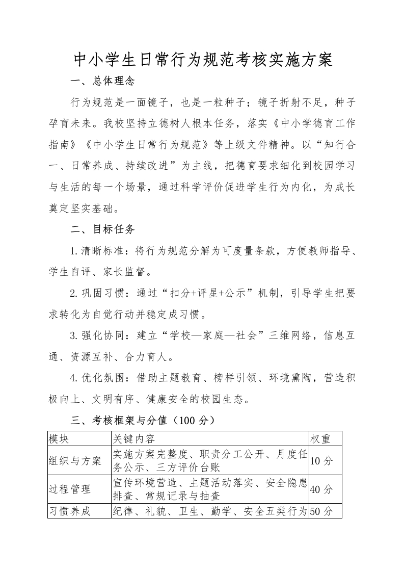 中小学生日常行为规范考核实施方案一、总体理念行为规范是一面镜子,也是一粒种子;镜子折射不足,种子孕育未来。我校坚持立德树人根本任务,落实《中小学德育工作指南》《中小学生日常行为规范》等上级文件精神。以“知行合一、日常养成、持续改进”为主线,把德育要求细化到校园学习与生活的每一个场景,通过科学评价促进学生行为内化,为成长奠定坚实基础。二、目标任务1.清晰标准:将行为规范分解为可度量条款,方便教师指导、学生自评、家长监督。2.巩固习惯:通过“扣分+评星+公示”机制,引导学生把要求转化为自觉行动并稳定成习惯。3.强化协同:建立“学校一家庭一社会”三维网络,信息互通、资源互补、合力育人。4.优化氛围:借助主题教育、榜样引领、环境熏陶,营造积极向上、文明有序、健康安全的校园生态。三、考核框架与分值(100分)模块关键内容权重组织与方案实施方案完整度、职责分工公开、月度任务公示、三方评价台账10分过程管理宣传环境营造、主题活动落实、安全隐患排查、常规记录与抽查40分习惯养成纪律、礼貌、卫生、勤学、安全五类行为50分