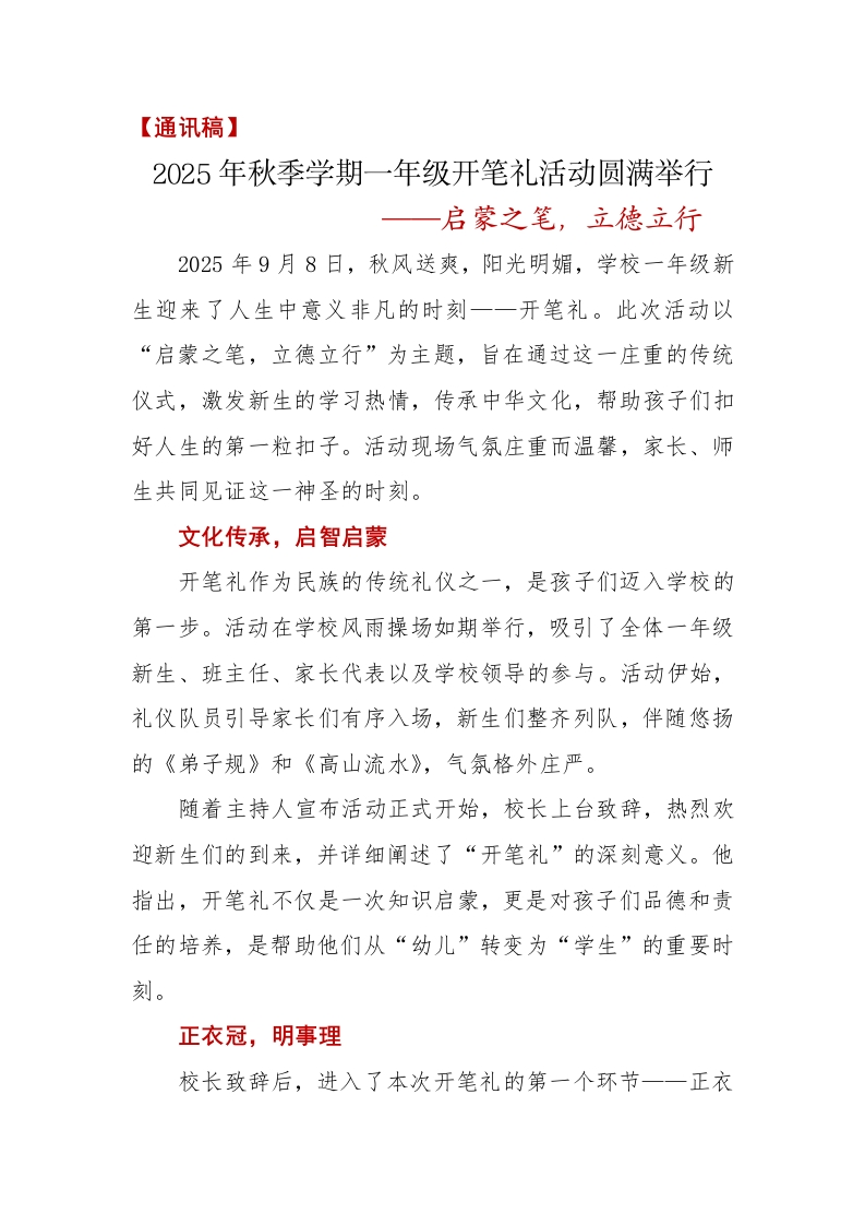 【通讯稿】2025年秋季学期一年级开笔礼活动圆满举行一启蒙之笔,立德立行2025年9月8日,秋风送爽,阳光明媚,学校一年级新生迎来了人生中意义非凡的时刻一一开笔礼。此次活动以“启蒙之笔,立德立行”为主题,旨在通过这一庄重的传统仪式,激发新生的学习热情,传承中华文化,帮助孩子们扣好人生的第一粒扣子。活动现场气氛庄重而温馨,家长、师生共同见证这一神圣的时刻。文化传承,启智启蒙开笔礼作为民族的传统礼仪之一,是孩子们迈入学校的第一步。活动在学校风雨操场如期举行,吸引了全体一年级新生、班主任、家长代表以及学校领导的参与。活动伊始,礼仪队员引导家长们有序入场,新生们整齐列队,伴随悠扬的《弟子规》和《高山流水》,气氛格外庄严。随着主持人宣布活动正式开始,校长上台致辞,热烈欢迎新生们的到来,并详细阐述了“开笔礼”的深刻意义。他指出,开笔礼不仅是一次知识启蒙,更是对孩子们品德和责任的培养,是帮助他们从“幼儿”转变为“学生”的重要时刻。正衣冠,明事理校长致辞后,进入了本次开笔礼的第一个环节一一正衣