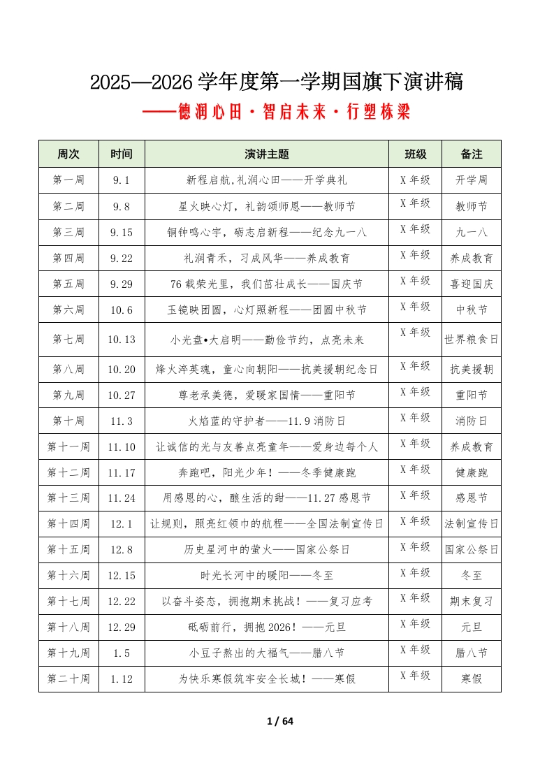 2025一2026学年度第一学期国旗下演讲稿德润心田·智启未来·行塑栋梁周次时间演讲主题班级备注第一周9.1新程启航,礼润心田一开学典礼X年级开学周第二周9.8星火映心灯,礼韵颂师恩一教师节X年级教师节第三周9.15铜钟鸣心宇,砺志启新程一一纪念九一八X年级九一八第四周9.22礼润青禾,习成风华养成教育X年级养成教育第五周9.2976载荣光里,我们茁壮成长国庆节X年级喜迎国庆第六周10.6玉镜映团圆,心灯照新程一一团圆中秋节X年级中秋节第七周X年级10.13小光盘·大启明一一勤俭节约,点亮未来世界粮食日第八周10.20烽火淬英魂,童心向朝阳抗美援朝纪念日X年级抗美援朝第九周10.27尊老承美德,爱暖家国情一一重阳节X年级重阳节第十周11.3火焰蓝的守护者一一11.9消防日X年级消防日第十一周11.10让诚信的光与友善点亮童年一一爱身边每个人X年级养成教育第十二周11.17奔跑吧,阳光少年!一一冬季健康跑X年级健康跑第十三周11.24用感恩的心,酿生活的甜一一11.27感恩节X年级感恩节第十四周12.1让规则,照亮红领巾的航程一一全国法制宣传日X年级法制宣传日第十五周12.8历史星河中的萤火一一国家公祭日X年级国家公祭日第十六周12.15时光长河中的暖阳一一冬至X年级冬至第十七周12.22以奋斗姿态,拥抱期末挑战!一一复习应考X年级期末复习第十八周12.29砥砺前行,拥抱2026!一一元旦X年级元旦第十九周1.5小豆子熬出的大福气一一腊八节X年级腊八节第二十周1.12为快乐寒假筑牢安全长城!一一寒假X年级寒假1/64