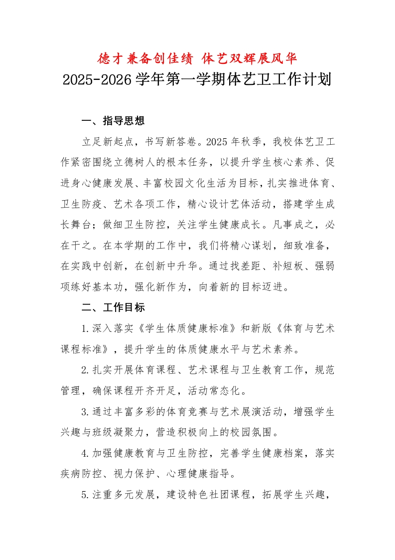 德才兼备创佳绩体艺双辉展风华2025-2026学年第一学期体艺卫工作计划一、指导思想立足新起点,书写新答卷。2025年秋季,我校体艺卫工作紧密围绕立德树人的根本任务,以提升学生核心素养、促进身心健康发展、丰富校园文化生活为目标,扎实推进体育、卫生防疫、艺术各项工作,精心设计艺体活动,搭建学生成长舞台;做细卫生防控,关注学生健康成长。凡事成之,必在干之。在本学期的工作中,我们将精心谋划,细致准备,在实践中创新,在创新中升华。通过找差距、补短板、强弱项练好基本功,强化新作为,向着新的目标迈进。二、工作目标1.深入落实《学生体质健康标准》和新版《体育与艺术课程标准》,提升学生的体质健康水平与艺术素养。2.扎实开展体育课程、艺术课程与卫生教育工作,规范管理,确保课程开齐开足,活动常态化。3.通过丰富多彩的体育竞赛与艺术展演活动,增强学生兴趣与班级凝聚力,营造积极向上的校园氛围。4.加强健康教育与卫生防控,完善学生健康档案,落实疾病防控、视力保护、心理健康指导。5.注重多元发展,建设特色社团课程,拓展学生兴趣,