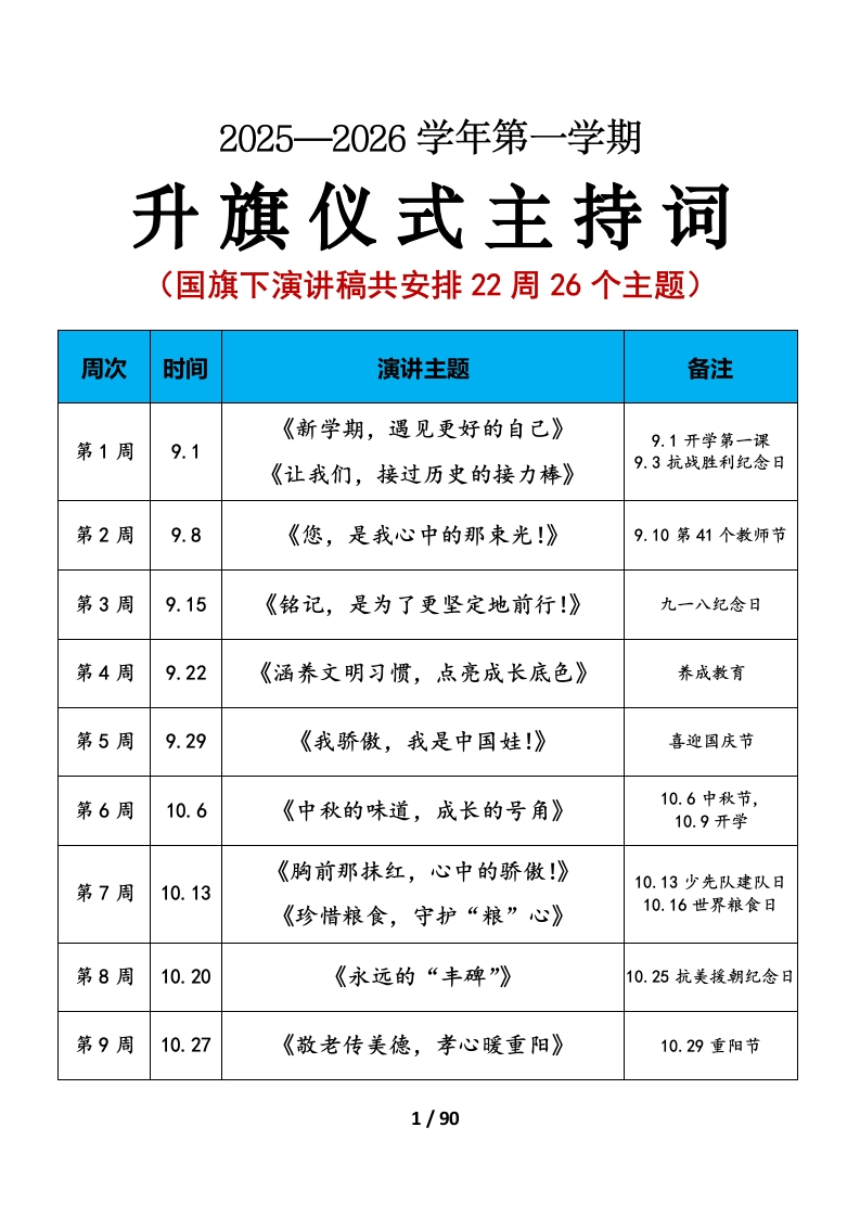 2025—2026学年第一学期升旗仪式主持词(国旗下演讲稿共安排22周26个主题)周次时间演讲主题备注《新学期,遇见更好的自己》第1周9.19.1开学第一课《让我们,接过历史的接力棒》9.3抗战胜利纪念日第2周9.8《您,是我心中的那束光!》9.10第41个教师节第3周9.15《铭记,是为了更坚定地前行!》九一八纪念日第4周9.22《涵养文明习惯,点亮成长底色》养成教育第5周9.29《我骄傲,我是中国蛙!》喜迎国庆节第6周10.6《中秋的味道,成长的号角》10.6中秋节,10.9开学《胸前那抹红,心中的骄傲!》第7周10.1310.13少先队建队日《珍惜粮食,守护“粮”心》10.16世界粮食日第8周10.20《永远的“丰碑”》10.25抗美接朝纪念日第9周10.27《敬老传美德,孝心暖重阳》10.29重阳节1/90