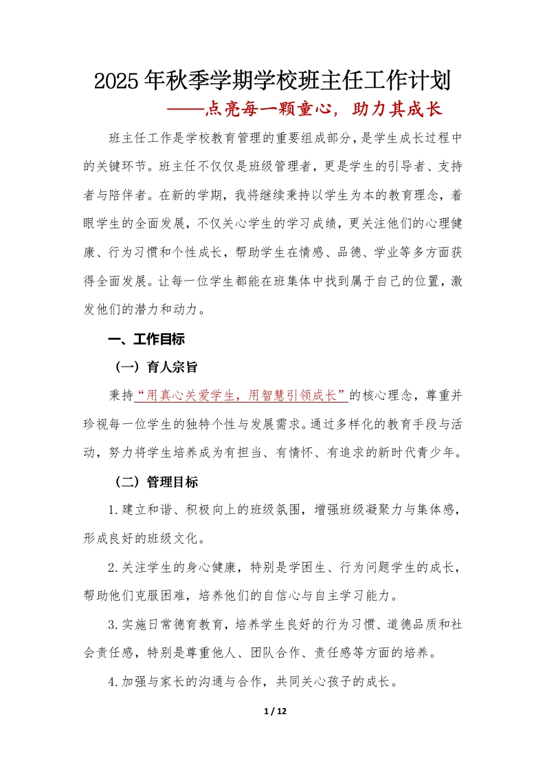 2025年秋季学期学校班主任工作计划一,点亮每一颗童心,助力其成长班主任工作是学校教育管理的重要组成部分,是学生成长过程中的关键环节。班主任不仅仅是班级管理者,更是学生的引导者、支持者与陪伴者。在新的学期,我将继续秉持以学生为本的教育理念,着眼学生的全面发展,不仅关心学生的学习成绩,更关注他们的心理健康、行为习惯和个性成长,帮助学生在情感、品德、学业等多方面获得全面发展。让每一位学生都能在班集体中找到属于自己的位置,激发他们的潜力和动力。一、工作目标(一)育人宗旨秉持“用真心关爱学生,用智慧引领成长”的核心理念,尊重并珍视每一位学生的独特个性与发展需求。通过多样化的教育手段与活动,努力将学生培养成为有担当、有情怀、有追求的新时代青少年。(二)管理目标1.建立和谐、积极向上的班级氛围,增强班级凝聚力与集体感,形成良好的班级文化。2.关注学生的身心健康,特别是学困生、行为问题学生的成长,帮助他们克服困难,培养他们的自信心与自主学习能力。3.实施日常德育教育,培养学生良好的行为习惯、道德品质和社会责任感,特别是尊重他人、团队合作、责任感等方面的培养。4.加强与家长的沟通与合作,共同关心孩子的成长。1/12