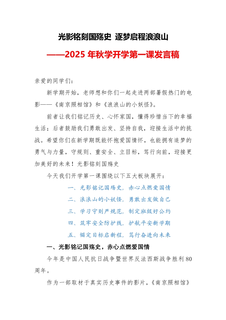 光影铭刻国殇史逐梦启程浪浪山一一2025年秋学开学第一课发言稿亲爱的同学们:新学期开始,老师想和你们一起走进两部暑假热门的电影一一《南京照相馆》和《浪浪山的小妖怪》。前者让我们铭记历史、心怀家国,懂得珍惜当下的幸福生活:后者鼓励我们勇敢出发、坚持自我,迎接生活中的挑战。希望你们在新学期既能怀抱爱国情怀,也能拥有追梦的勇气与力量,守规则、重安全、立目标,笃行向前,迎接更加美好的未来!光影铭刻国殇史今天我们开学第一课围绕以下五大板块展开:一、光影铭记国殇史,赤心,点燃爱国情二、浪浪山的小妖怪,勇敢出发做自己三、学习守则严规范,制定班级好公约四、筑牢安全防护线,护航平安新学期五、锚定目标启新程,笃行奋进向未来一、光影铭记国殇史,赤心点燃爱国情今年是中国人民抗日战争暨世界反法西斯战争胜利80周年。作为一部取材于真实历史事件的影片,《南京照相馆》