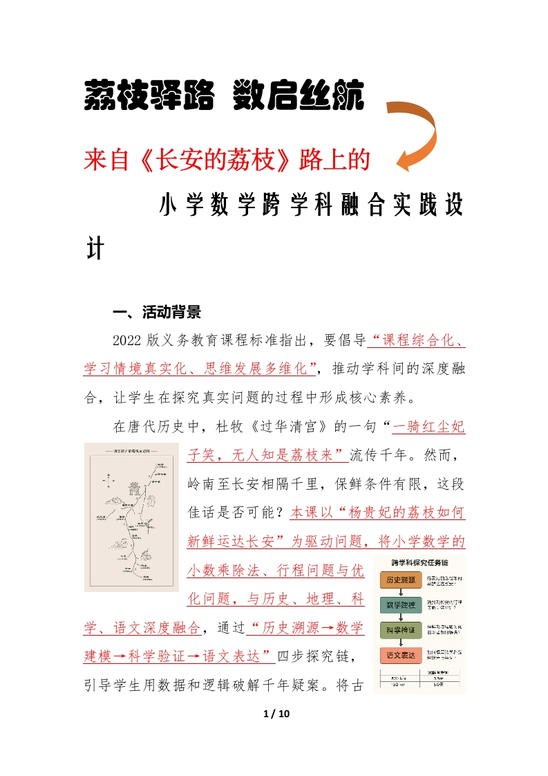 荔枝驿路数启丝航来自《长安的荔枝》路上的小学数学跨学科融合实践设计一、活动背景2022版义务教育课程标准指出,要倡导“课程综合化、学习情境真实化、思维发展多维化”,推动学科间的深度融合,让学生在探究真实问题的过程中形成核心素养。在唐代历史中,杜牧《过华清宫》的一句“一骑红尘妃子笑,无人知是荔枝来”流传千年。然而,岭南至长安相隔千里,保鲜条件有限,这段佳话是否可能?本课以“杨贵妃的荔枝如何新鲜运达长安”为驱动问题,将小学数学的八总小数乘除法、行程问题与优跨学科深究任钙链历史潮近腰进州化问题,与历史、地理、科数学往税训7学、语文深度融合,通过“历史溯源→数学科学检证长建模一科学验证一语文表达”四步探究链,语文表达不引导学生用数据和逻辑破解千年疑案。将古s01/10