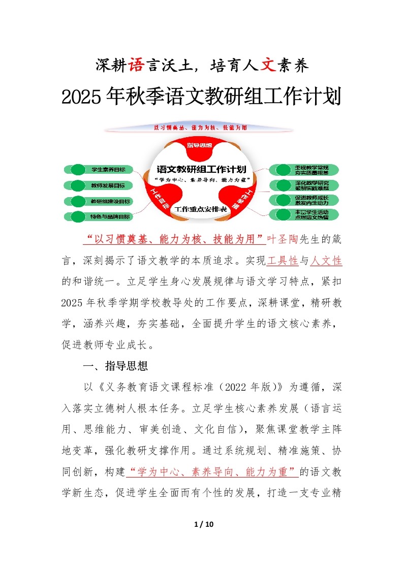 深耕语言沃土,培育人文素养2025年秋季语文教研组工作计划以习微燕是、能力为核、极能为州指导思粗学生森养目标语文致研组工作计龙“学为中心、素莽子向、能力为亚和较师发展目标深化学研究破解实践难透促进软师成长效研组速设目标发内生动力工作重点安排表丰学生活动特色与品牌目标点语文“以习惯奠基、能力为核、技能为用”叶圣陶先生的箴言,深刻揭示了语文教学的本质追求。实现工具性与人文性的和谐统一。立足学生身心发展规律与语文学习特点,紧扣2025年秋季学期学校教导处的工作要点,深耕课堂,精研教学,涵养兴趣,夯实基础,全面提升学生的语文核心素养,促进教师专业成长。一、指导思想以《义务教育语文课程标准(2022年版)》为遵循,深入落实立德树人根本任务。立足学生核心素养发展(语言运用、思维能力、审美创造、文化自信),聚焦课堂教学主阵地变革,强化教研支撑作用。通过系统规划、精准施策、协同创新,构建“学为中心、素养导向、能力为重”的语文教学新生态,促进学生全面而有个性的发展,打造一支专业精1/10
