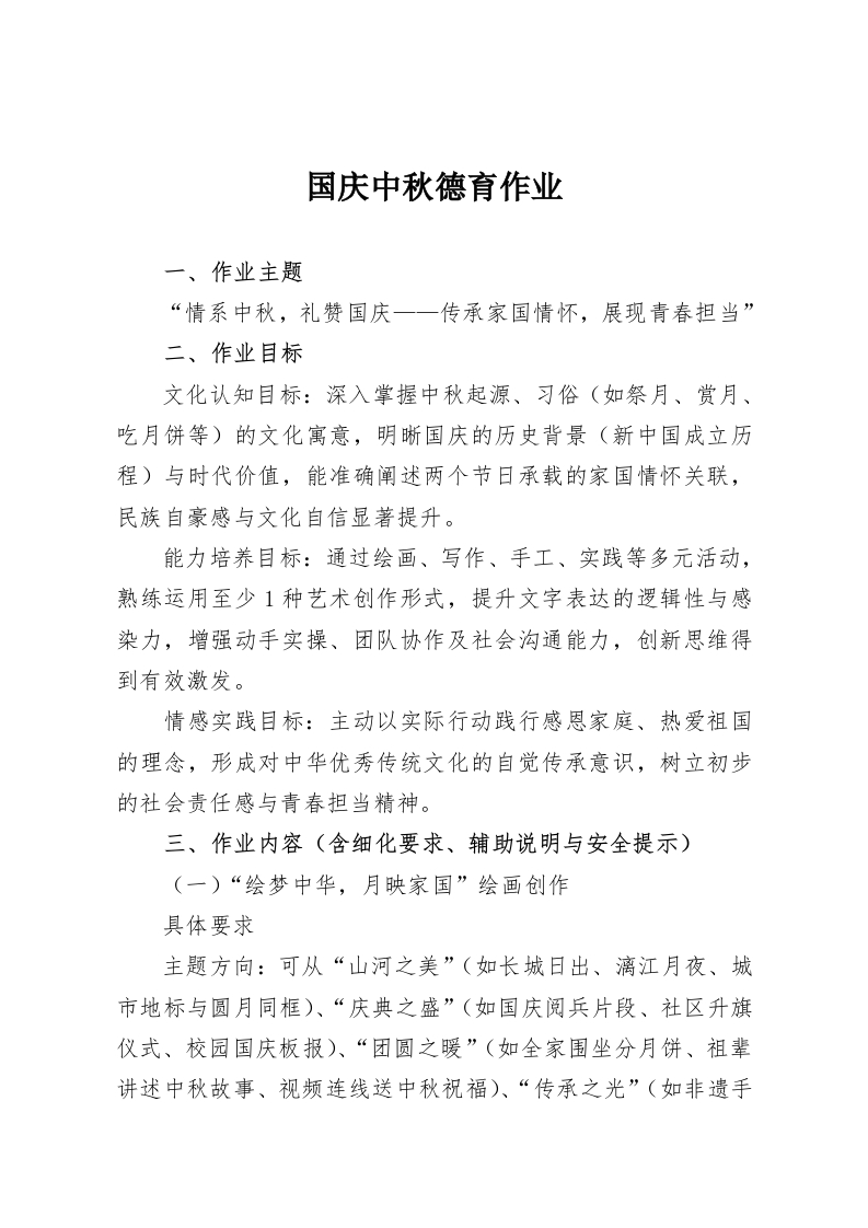 国庆中秋德育作业一、作业主题“情系中秋,礼赞国庆一一传承家国情怀,展现青春担当”二、作业目标文化认知目标:深入掌握中秋起源、习俗(如祭月、赏月、吃月饼等)的文化寓意,明晰国庆的历史背景(新中国成立历程)与时代价值,能准确阐述两个节日承载的家国情怀关联,民族自豪感与文化自信显著提升。能力培养目标:通过绘画、写作、手工、实践等多元活动,熟练运用至少1种艺术创作形式,提升文字表达的逻辑性与感染力,增强动手实操、团队协作及社会沟通能力,创新思维得到有效激发。情感实践目标:主动以实际行动践行感恩家庭、热爱祖国的理念,形成对中华优秀传统文化的自觉传承意识,树立初步的社会责任感与青春担当精神。三、作业内容(含细化要求、辅助说明与安全提示)(一)“绘梦中华,月映家国”绘画创作具体要求主题方向:可从“山河之美”(如长城日出、漓江月夜、城市地标与圆月同框)、“庆典之盛”(如国庆阅兵片段、社区升旗仪式、校园国庆板报)、“团圆之暖”(如全家围坐分月饼、祖辈讲述中秋故事、视频连线送中秋祝福)、“传承之光”(如非遗手