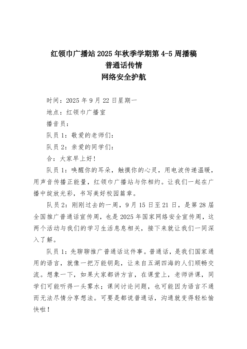 红领巾广播站2025年秋季学期第4-5周播稿普通话传情网络安全护航时间:2025年9月22日星期一地点:红领巾广播室播音员:队员1:敬爱的老师们:队员2:亲爱的同学们:合:大家早上好!队员1:唤醒你的耳朵,触摸你的心灵,用电波传递温暖,用声音传播正能量,红领巾广播站与你相约。让我们一起在广播中绽放光彩,书写美好校园篇章。队员2:刚刚过去的一周,9月15日至21日,是第28届全国推广普通话宣传周,也是2025年国家网络安全宣传周,这两个活动与我们的学习生活息息相关,接下来就让我们一同深入了解。队员1:先聊聊推广普通话这件事。普通话,是我们国家通用的语言,就像一把万能钥匙,让来自五湖四海的人们顺畅交流。想象一下,如果大家都讲方言,在课堂上,老师讲课,同学们可能听得一头雾水;课间讨论问题,也可能因为语言不通而无法尽情分享想法。可要是都说普通话,沟通就变得轻松愉快啦!