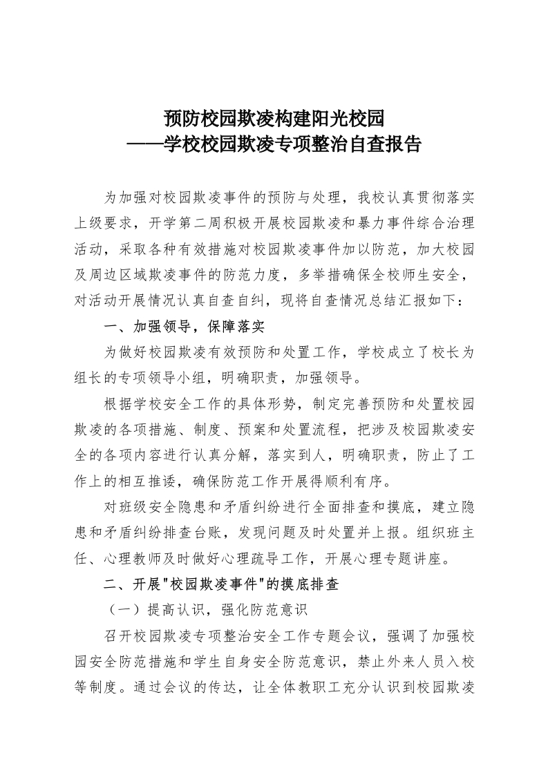 预防校园欺凌构建阳光校园学校校园欺凌专项整治自查报告为加强对校园欺凌事件的预防与处理,我校认真贯彻落实上级要求,开学第二周积极开展校园欺凌和暴力事件综合治理活动,采取各种有效措施对校园欺凌事件加以防范,加大校园及周边区域欺凌事件的防范力度,多举措确保全校师生安全,对活动开展情况认真自查自纠,现将自查情况总结汇报如下:一、加强领导,保障落实为做好校园欺凌有效预防和处置工作,学校成立了校长为组长的专项领导小组,明确职责,加强领导。根据学校安全工作的具体形势,制定完善预防和处置校园欺凌的各项措施、制度、预案和处置流程,把涉及校园欺凌安全的各项内容进行认真分解,落实到人,明确职责,防止了工作上的相互推诿,确保防范工作开展得顺利有序。对班级安全隐患和矛盾纠纷进行全面排查和摸底,建立隐患和矛盾纠纷排查台账,发现问题及时处置并上报。组织班主任、心理教师及时做好心理疏导工作,开展心理专题讲座。二、开展"校园欺凌事件"的摸底排查(一)提高认识,强化防范意识召开校园欺凌专项整治安全工作专题会议,强调了加强校园安全防范措施和学生自身安全防范意识,禁止外来人员入校等制度。通过会议的传达,让全体教职工充分认识到校园欺凌