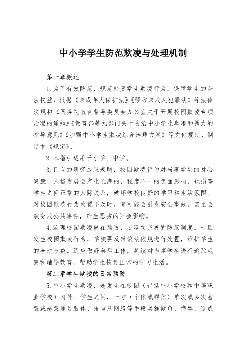 中小学学生防范欺凌与处理机制第一章概述1.为了有效防范、规范处置学生欺凌行为,保障学生的合法权益,根据《未成年人保护法》《预防未成人犯罪法》等法律法规和《国务院教育督导委员会办公室关于开展校园欺凌专项治理的通知》《教育部等九部门关于防治中小学生欺凌和暴力的指导意见》《加强中小学生欺凌综合治理方案》等文件规定,制定本《规定》。2.本指引适用于小学、中学。3.已有的研究成果表明,校园欺凌行为对当事学生的身心健康、人格发展会产生长期的、程度不一的负面影响,也损害学生之间正常的人际关系,破坏学校良好的学习和生活氛围。对校园欺凌行为处置不及时,有可能会引发安全事故,甚至会演变成公共事件,产生恶劣的社会影响。4.治理校园欺凌重在预防,要建立完善的防范制度。一旦发生校园欺凌行为,学校要及时依法依规进行处置,维护学生的合法权益。还应做好善后工作,持续对当事学生进行追踪观察和辅导教育,帮助学生恢复正常的学习生活。第二章学生欺凌的日常预防5.中小学生欺凌,是发生在校园(包括中小学校和中等职业学校)内外、学生之间,一方(个体或群体)单次或多次蓄意或恶意通过肢体、语言及网络等手段实施欺负、侮辱,造成