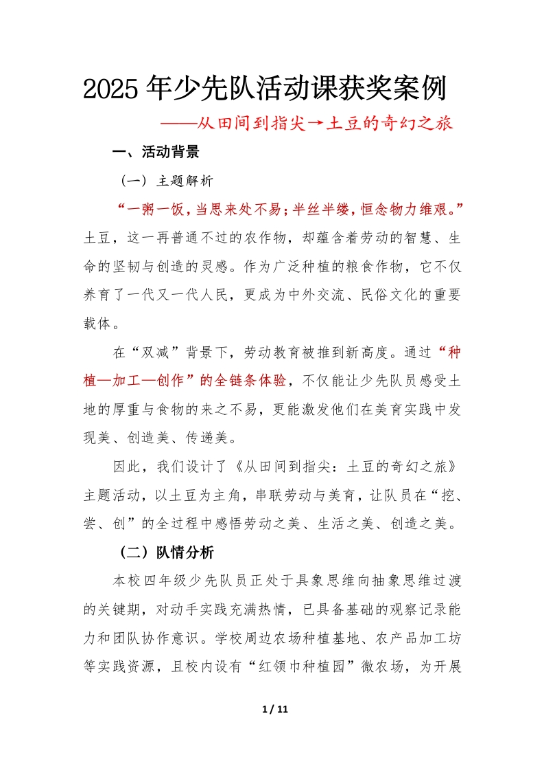 2025年少先队活动课获奖案例—从田间到指尖→土豆的奇幻之旅一、活动背景(一)主题解析“一粥一饭,当思来处不易;半丝半缕,恒念物力维艰。”土豆,这一再普通不过的农作物,却蕴含着劳动的智慧、生命的坚韧与创造的灵感。作为广泛种植的粮食作物,它不仅养育了一代又一代人民,更成为中外交流、民俗文化的重要载体。在“双减”背景下,劳动教育被推到新高度。通过“种植一加工一创作”的全链条体验,不仅能让少先队员感受土地的厚重与食物的来之不易,更能激发他们在美育实践中发现美、创造美、传递美。因此,我们设计了《从田间到指尖:土豆的奇幻之旅》主题活动,以土豆为主角,串联劳动与美育,让队员在“挖、尝、创”的全过程中感悟劳动之美、生活之美、创造之美。(二)队情分析本校四年级少先队员正处于具象思维向抽象思维过渡的关键期,对动手实践充满热情,已具备基础的观察记录能力和团队协作意识。学校周边农场种植基地、农产品加工坊等实践资源,且校内设有“红领巾种植园”微农场,为开展1/11