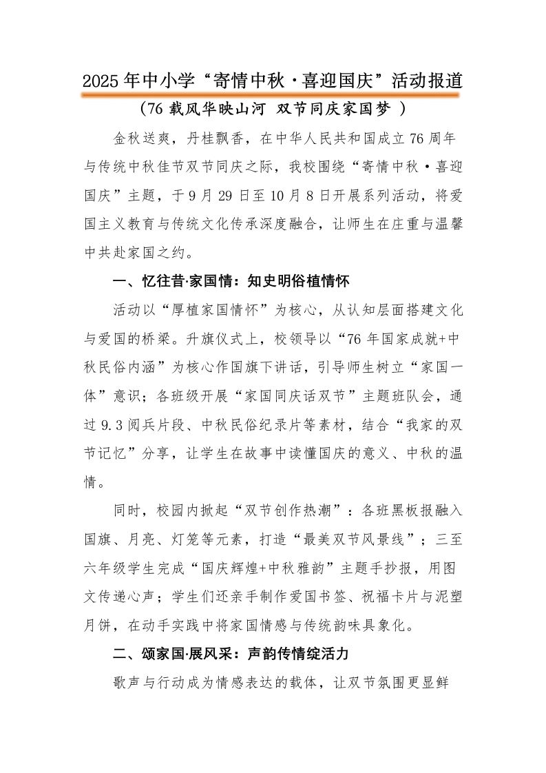 2025年中小学“寄情中秋·喜迎国庆”活动报道(76载风华映山河双节同庆家国梦)金秋送爽,丹桂飘香,在中华人民共和国成立76周年与传统中秋佳节双节同庆之际,我校围绕“寄情中秋·喜迎国庆”主题,于9月29日至10月8日开展系列活动,将爱国主义教育与传统文化传承深度融合,让师生在庄重与温馨中共赴家国之约。一、忆往昔家国情:知史明俗植情怀活动以“厚植家国情怀”为核心,从认知层面搭建文化与爱国的桥梁。升旗仪式上,校领导以“76年国家成就+中秋民俗内涵”为核心作国旗下讲话,引导师生树立“家国一体”意识;各班级开展“家国同庆话双节”主题班队会,通过9.3阅兵片段、中秋民俗纪录片等素材,结合“我家的双节记忆”分享,让学生在故事中读懂国庆的意义、中秋的温情。同时,校园内掀起“双节创作热潮”:各班黑板报融入国旗、月亮、灯笼等元素,打造“最美双节风景线”;三至六年级学生完成“国庆辉煌+中秋雅韵”主题手抄报,用图文传递心声;学生们还亲手制作爱国书签、祝福卡片与泥塑月饼,在动手实践中将家国情感与传统韵味具象化。二、颂家国·展风采:声韵传情绽活力歌声与行动成为情感表达的载体,让双节氛围更显鲜