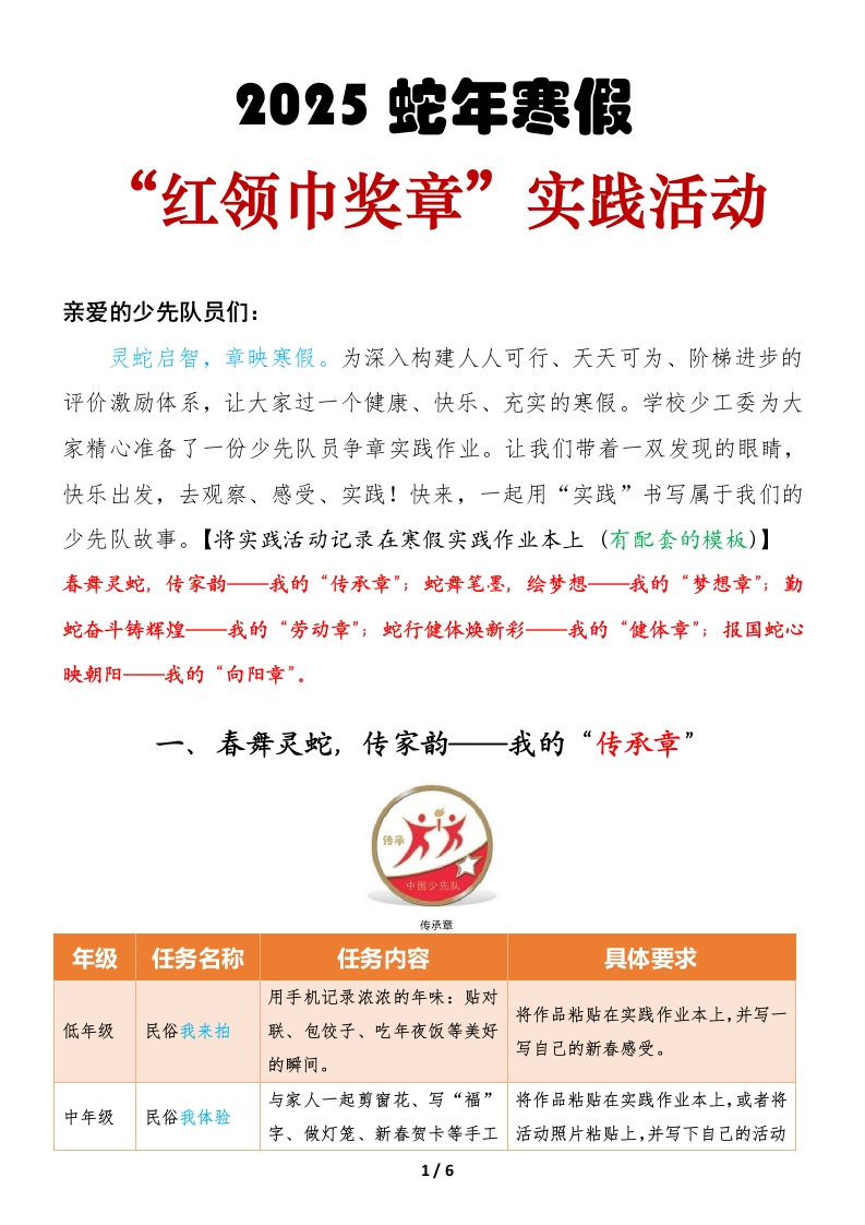 2025蛇年寒假“红领巾奖章”实践活动亲爱的少先队员们:灵蛇启智,章映寒假。为深入构建人人可行、天天可为、阶梯进步的评价激励体系,让大家过一个健康、快乐、充实的寒假。学校少工委为大家精心准备了一份少先队员争章实践作业。让我们带着一双发现的眼睛,快乐出发,去观察、感受、实践!快来,一起用“实践”书写属于我们的少先队故事。【将实践活动记录在寒假实践作业本上(有配套的模板)】春舞灵蛇,传家韵—我的“传承章”;蛇舞笔墨,绘梦想—我的“梦想章”;勤蛇奋斗铸辉煌一我的“劳动章”;蛇行健体焕新彩一我的“健体章”;报国蛇心映朝阳—我的“向阳章”。一、春舞灵蛇,传家韵一我的“传承章”中国少先传承章年级任务名称任务内容具体要求用手机记录浓浓的年味:贴对将作品粘贴在实践作业本上,并写低年级民俗我来拍联、包饺子、吃年夜饭等美好写自己的新春感受。的瞬间。与家人一起剪窗花、写“福”将作品粘贴在实践作业本上,或者将中年级民俗我体验字、做灯笼、新春贺卡等手工活动照片粘贴上,并写下自己的活动1/6