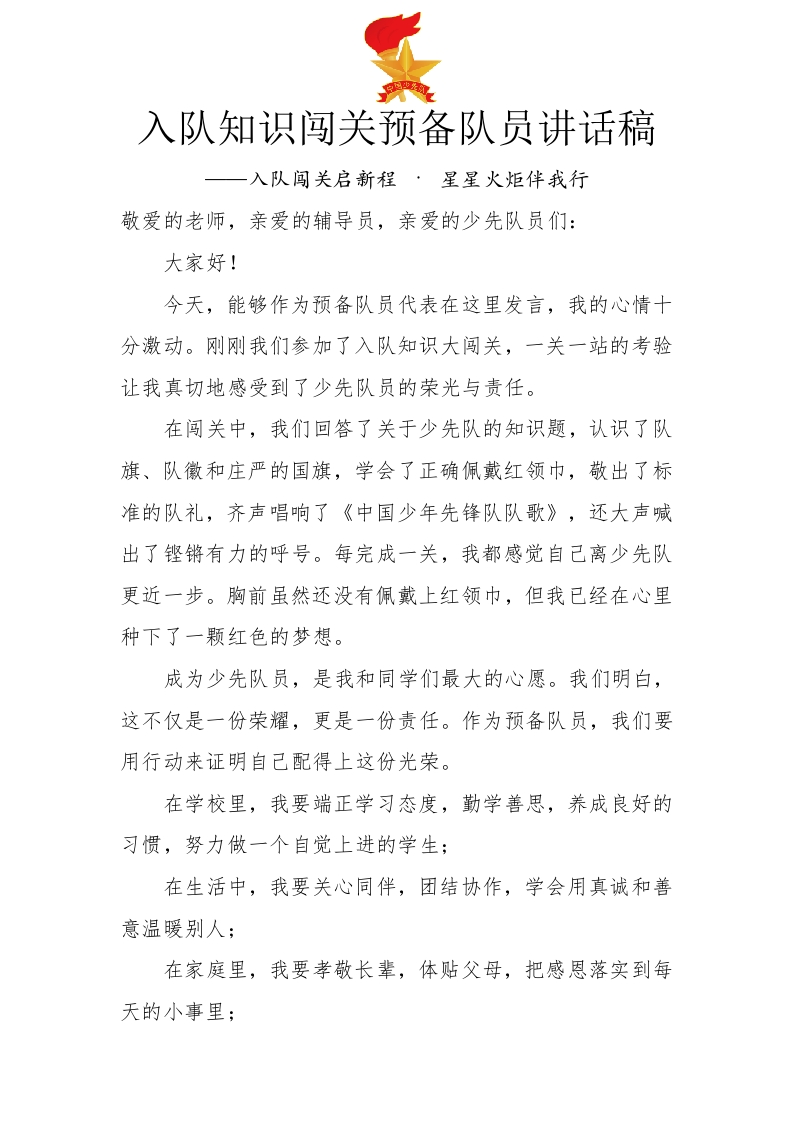 ®入队知识闯关预备队员讲话稿一入队闯关启新程·星星火炬伴我行敬爱的老师,亲爱的辅导员,亲爱的少先队员们:大家好!今天,能够作为预备队员代表在这里发言,我的心情十分激动。刚刚我们参加了入队知识大闯关,一关一站的考验让我真切地感受到了少先队员的荣光与责任。在闯关中,我们回答了关于少先队的知识题,认识了队旗、队徽和庄严的国旗,学会了正确佩戴红领巾,敬出了标准的队礼,齐声唱响了《中国少年先锋队队歌》,还大声喊出了铿锵有力的呼号。每完成一关,我都感觉自己离少先队更近一步。胸前虽然还没有佩戴上红领巾,但我已经在心里种下了一颗红色的梦想。成为少先队员,是我和同学们最大的心愿。我们明白,这不仅是一份荣耀,更是一份责任。作为预备队员,我们要用行动来证明自己配得上这份光荣。在学校里,我要端正学习态度,勤学善思,养成良好的习惯,努力做一个自觉上进的学生:在生活中,我要关心同伴,团结协作,学会用真诚和善意温暖别人;在家庭里,我要孝敬长辈,体贴父母,把感恩落实到每天的小事里;
