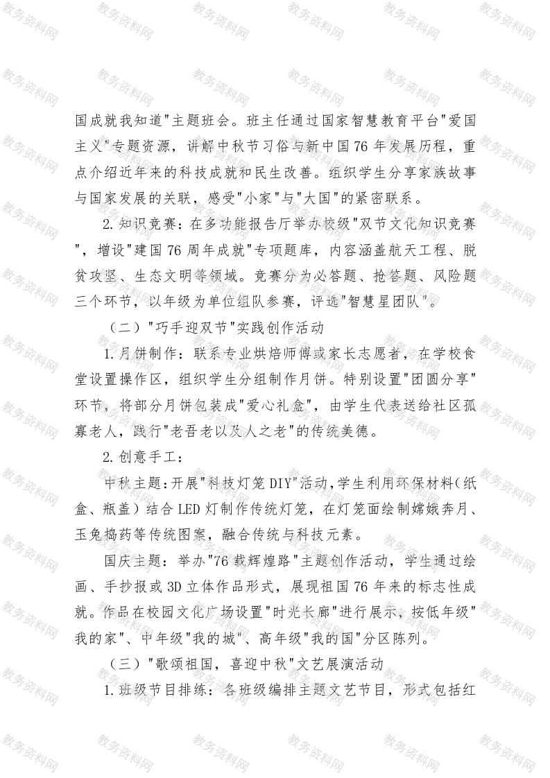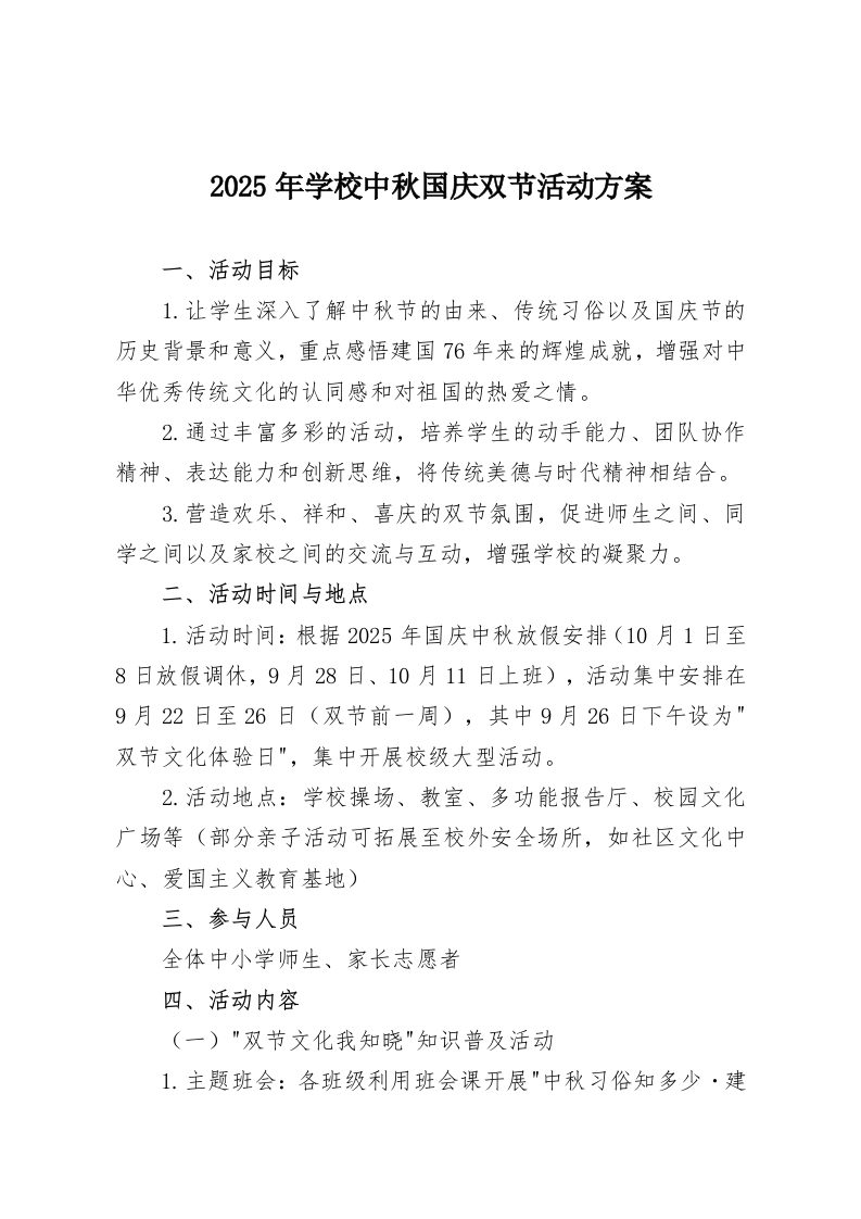 2025年学校中秋国庆双节活动方案一、活动目标1.让学生深入了解中秋节的由来、传统习俗以及国庆节的历史背景和意义,重点感悟建国76年来的辉煌成就,增强对中华优秀传统文化的认同感和对祖国的热爱之情。2.通过丰富多彩的活动,培养学生的动手能力、团队协作精神、表达能力和创新思维,将传统美德与时代精神相结合。3.营造欢乐、祥和、喜庆的双节氛围,促进师生之间、同学之间以及家校之间的交流与互动,增强学校的凝聚力。二、活动时间与地点1.活动时间:根据2025年国庆中秋放假安排(10月1日至8日放假调休,9月28日、10月11日上班),活动集中安排在9月22日至26日(双节前一周),其中9月26日下午设为"双节文化体验日”,集中开展校级大型活动。2.活动地点:学校操场、教室、多功能报告厅、校园文化广场等(部分亲子活动可拓展至校外安全场所,如社区文化中心、爱国主义教育基地)三、参与人员全体中小学师生、家长志愿者四、活动内容(一)"双节文化我知晓"知识普及活动1.主题班会:各班级利用班会课开展"中秋习俗知多少·建