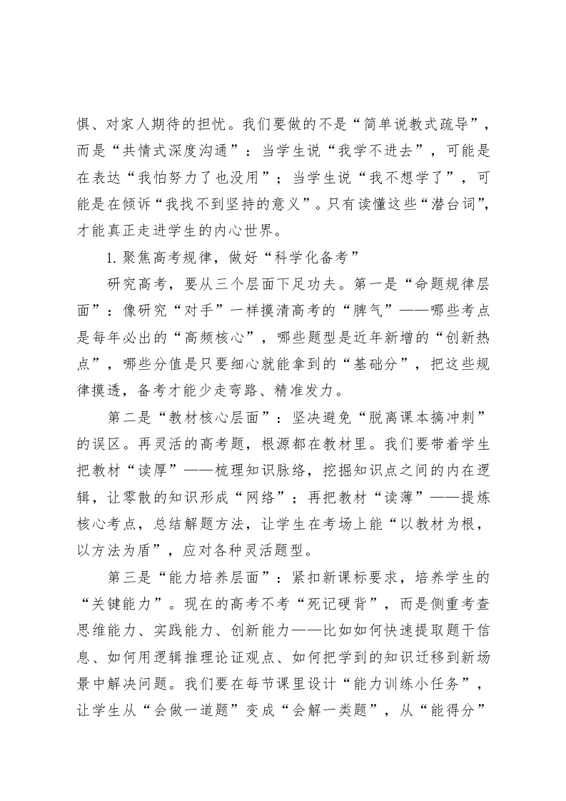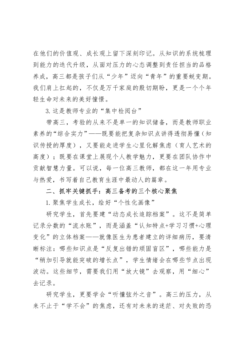 2026届高三学情分析会,校长讲话:把握关键维度,决胜260天各位老师,同志们:刚才近两个小时的学情剖析,满是干货、饱含心血一一年级组长的数据分析为我们找准了前行坐标,班主任的经验分享帮我们打通了突破堵点,教学主任的部署规划让我们明晰了发力方向。每一组数据、每一个案例、每一条建议,都是未来260天冲刺路上最宝贵的“指南针”。站在新学年的起点,面对2026年高考这场硬仗,今天我想围绕四个“关键维度”,和大家聊聊心里话。一、读懂关键价值:高三学年的三重特殊意义1.这是学校品牌的“核心展示期”高三是学校教育质量的“晴雨表”,社会看待一所学校,往往先看高考成绩,但我们更要清楚:这个“成绩”不只是冰冷的分数,更是学校教育理念的生动实践、管理水平的集中体现、师资团队的实力证明。从这里走出的每一位高三学子,都是学校行走的“活名片”一一他们的综合素养是否扎实、精神状态是否昂扬、未来发展是否有后劲,才是我们教育成果最真实的底色。2.这是学生人生的“重要岔路口”十八岁的年纪,恰逢人生第一次自主选择的关键节点。高三这一年,不仅决定着孩子们能否踏入理想大学的校门,更会
