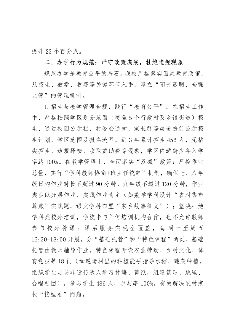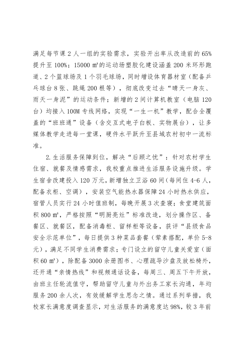 农村初中学校规范办学亮点汇报:扎根乡土守规范,提质赋能育新人尊敬的各位领导、同仁:我校地处XX乡镇中心区域,辐射周边5个行政村,服务半径约8公里,是当地农村学生接受初中教育的核心阵地。学校现有教学班12个,学生486人(其中留守儿童152人,占比31.3%),教职工42人(本科及以上学历38人,中级及以上职称25人)。近年来,我校始终以《义务教育学校管理标准》为纲领,紧扣“规范办学、提质增效”核心目标,直面农村教育资源薄弱、生源结构复杂等现实问题,在硬件改善、管理优化、质量提升等方面精准发力,逐步走出一条符合农村实际的规范办学之路,现将主要亮点汇报如下:一、办学条件达标:补齐农村短板,筑牢育人根基农村学校的发展,硬件是基础。我校坚持“向上争取、向内挖潜”,全力破解设施落后难题,让农村学生享有与城区学校同质的学习生活环境。1.硬件设施提质升级,实现“从有到优”:近3年,通过申报省级农村教育专项补助、县级财政配套及社会爱心企业捐赠等渠道,累计投入860万元用于硬件改造。其中,2800m的教学楼翻新工程不仅更换了老化门窗、墙面,还增设了无障碍通道和防滑地面,保障学生安全;理化生实验室按国家一类标准改造,配备全新实验器材320套(含数字化实验设备20套),