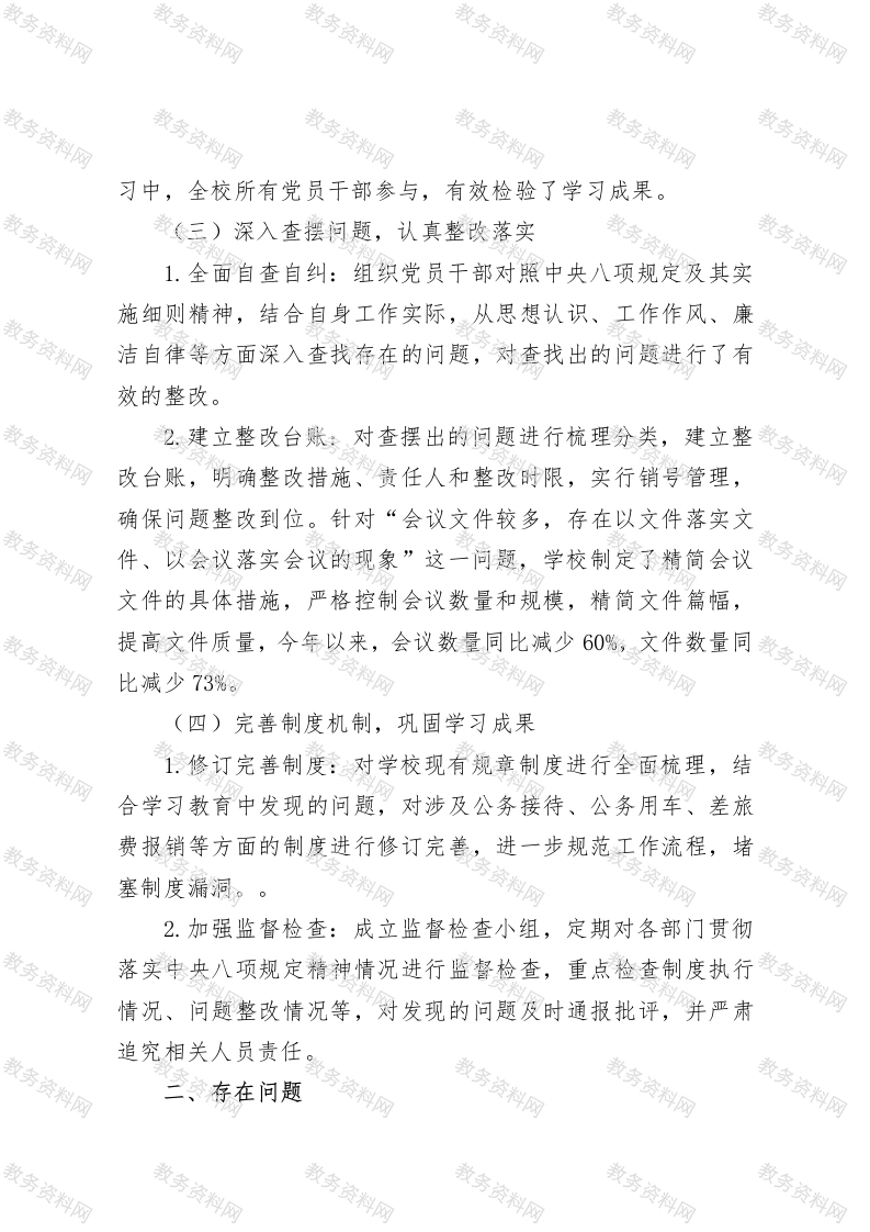 深入贯彻中央八项规定精神学习教育总结自深入贯彻中央八项规定精神学习教育开展以来,我校党组织高度重视,严格按照上级要求,扎实推进学习教育各项工作,在学查改各环节取得了一定成效,现将学习教育情况总结如下:一、主要做法与成效(一)强化组织领导,精心安排部署学校成立了以党委书记为组长的学习教育工作领导小组,统筹协调全校学习教育工作。制定并印发了《学校深入贯彻中央八项规定精神学习教育实施方案》,明确学习教育的目标任务、方法步骤和具体要求,确保学习教育有序开展。组织召开全校动员大会,传达上级精神,对学习教育进行全面部署,要求全体党员干部深刻认识学习教育的重要性,切实增强贯彻落实中央八项规定精神的思想自觉和行动自觉。(二)加强学习研讨,提升思想认识1.丰富学习形式:采取集中学习与个人自学相结合、专题辅导与交流研讨相结合、线上学习与线下学习相结合等方式,组织党员干部深入学习习近平总书记关于加强党的作风建设的重要论述、中央八项规定及其实施细则精神,以及上级有关文件和会议精神。2.创新学习载体:利用“学习强国”、微信等平台,及时推送学习资料和工作动态,方便党员干部随时随地学习。在学