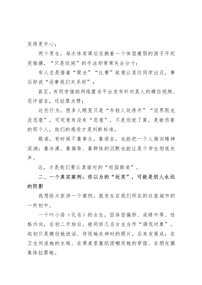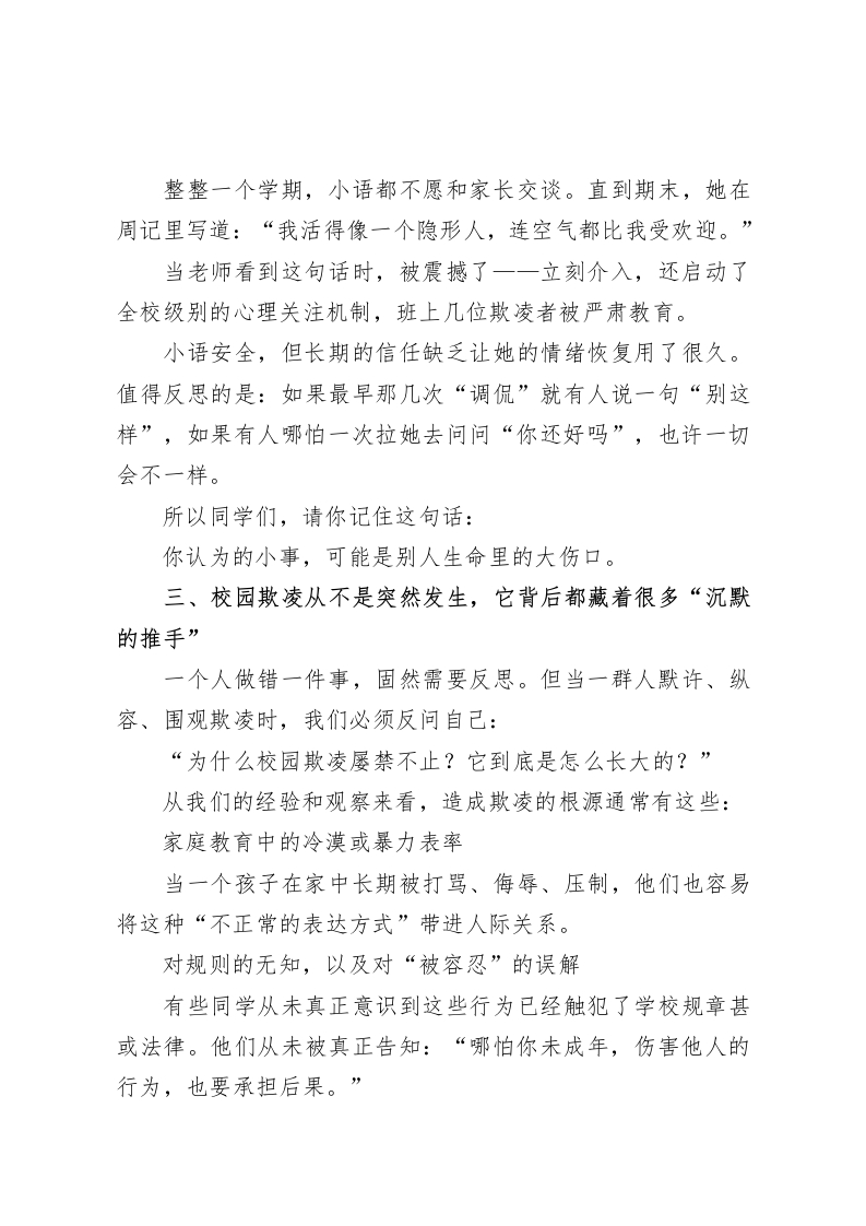 校长在国旗下讲话:拒绝校园欺凌,让每一个学生在阳光中成长尊敬的各位老师,亲爱的同学们:大家早上好。今天,我们齐聚在这片熟悉的草坪上,迎着晨光和升起的五星红旗,一同聆听这次国旗下讲话。我想利用这个庄严的时刻,与大家真诚地谈一谈一个不轻松,却又必须重视的主题:《拒绝校园欺凌,共建和谐校园》。这一讲,我不想“照本宣科”。不念定义,不空喊口号。我只希望,能用一位教育工作者的视角,一位长期陪伴你们成长的“守望者”的身份,从心底和大家好好聊聊:我们该如何共同守护这片校园的纯净与尊严。一、当打闹变成伤害一一什么才是真正的“欺凌”?首先,我们要统一一个最基本的认知:校园欺凌不是“孩子间的小打小闹”,它更不是“谁皮一点罢了”。很多学生问我:“校长,什么叫校园欺凌?是不是打架了就是?”我告诉他,并不是所有争执和摩擦都叫欺凌。我们在校园里难免有磕磕绊绊的误会、意见不合甚至有激烈吵嘴,但欺凌,是一种带有目的性、持续性、践踏他人尊严的“主动伤害行为”。它可能是这样的:群体围着某个同学起哄、喊奇怪绰号,他脸红了,全班却