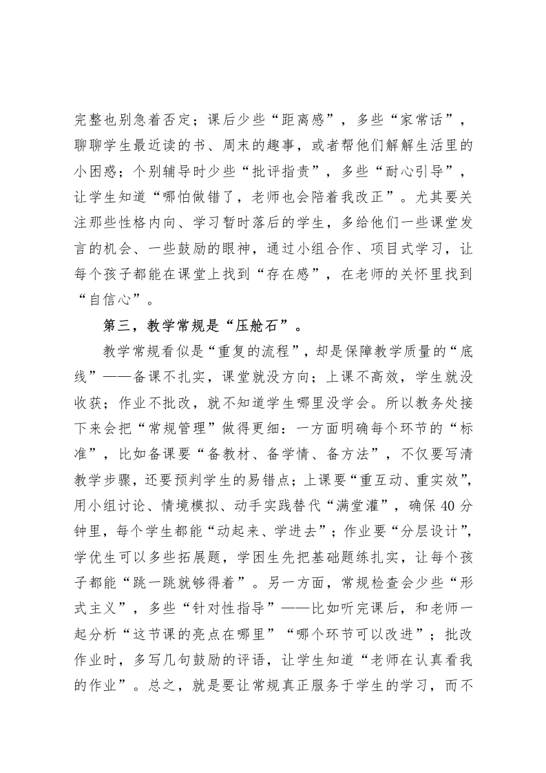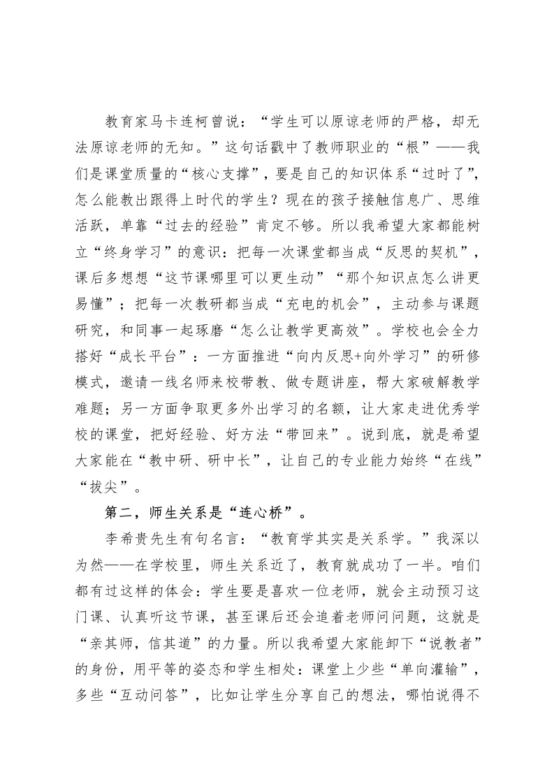 校长在全体教师大会上发言:抓实教学关键环节,守护每一份教育期待各位老师:上午好!当晨光洒满校园,看到大家匆匆走向教室的身影:当夜色笼罩办公楼,望见办公室里亮着的灯火一一我总想起一句话:“教育的温度,藏在每个教师的坚守里。”今天我们聚在这里,不谈空泛的理论,只聊一件事:如何守住育人初心,把教学职责扛得更稳,让教育质量提得更实。首先,我要代表学校,向每一位躬身讲台的老师道声感谢:是你们的晨光备课、深夜批改,是你们的课堂叮嘱、课后谈心,才让咱们学校的教育土壤,始终充满生机与力量。咱们常说“抓成绩是教师的本分”,这话背后藏着三重期待:学生眼里对知识的渴望,盼着通过学习长出“飞翔的翅膀”:家长口中对孩子的期盼,盼着孩子能在校园里学有所成;学校肩上对教育的担当,盼着能为社会培养“有用的人才”。而这三重期待的落脚点,都离不开我们把学生的学业成绩抓实。但大家都明白,成绩从来不是“蛮干”出来的一一它需要我们的“教”有方向、有方法,更需要学生的“学”有动力、有习惯。今天,我想结合咱们学校的教学实践,和大家分享五个“育人关键点”,希望能和大家一起,把教学这条路走得更顺、更实。第一,专业提升是“动力源”。