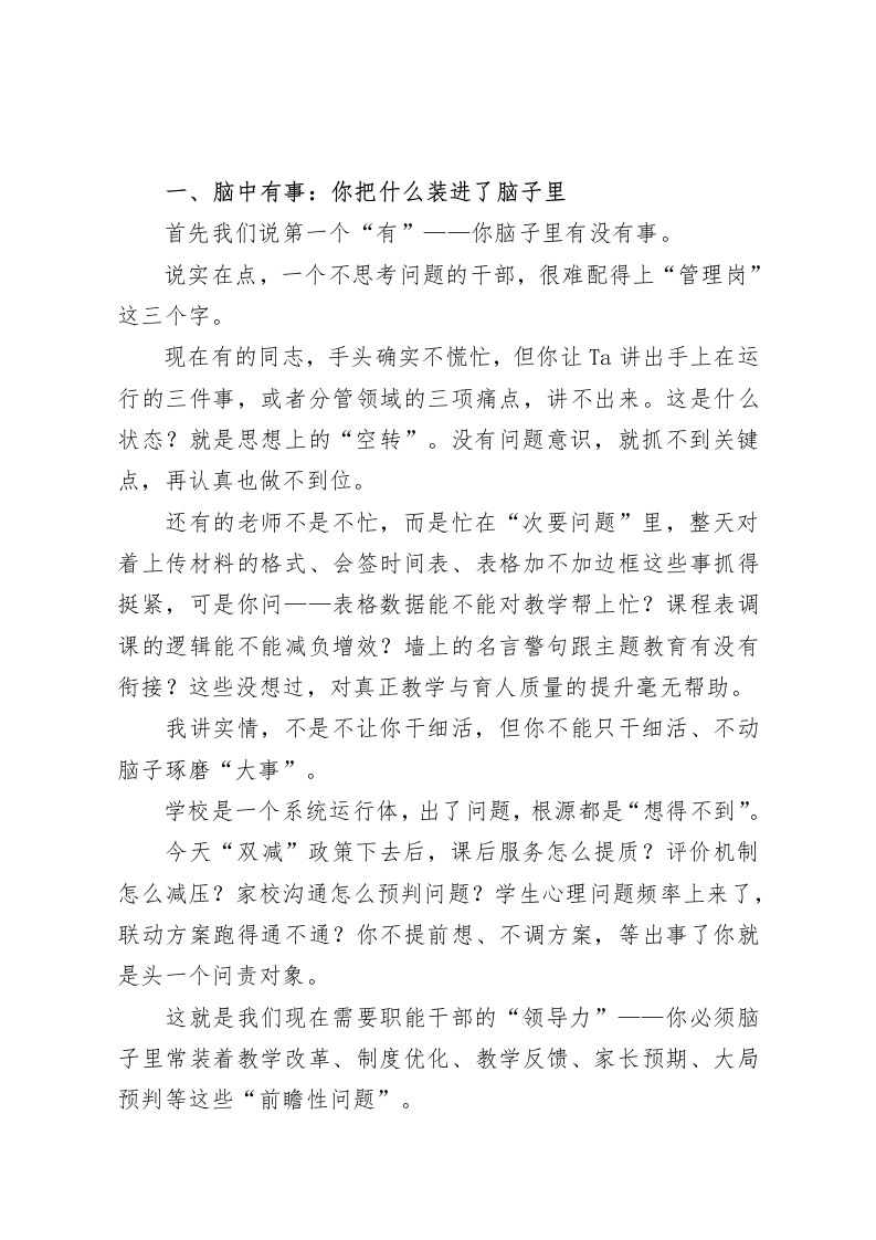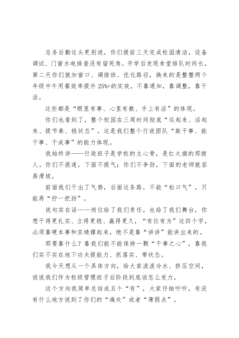校长在行政班子会上讲话:以“五个有”锻造干部执行力,持续巩固开学优质开局同志们:下午好!我们今天把行政班子成员全部召集到一块,既是对前期工作的总结和提气,也是对接下来阶段工作的理一理方向、定一定位。站在第四周的节点回过头看,这个学期开局开得不容易,但我们确实开得不赖。从筹备、报到、开课到校园状态落稳,只用了不到三天,非常“干脆利落”,非常“有章有法”。这里我要先给在座的各位说句最朴实的感谢一一大家辛苦了,也干得漂亮。我们学校不靠喊口号,靠的是人踏实、事扎实。老实说,敢在开学不到一个月的时间里,就能把人心稳住、秩序理顺,没有三两下子真办不下来。我不说空的,咱们看几个细节。教务处提前进场,一周内完成了全校教材清点、发放、补缺,几轮课程编排硬是调整了5稿,把插班生、特岗教师的安排也压进来了一一开学第一天,就能让孩子带着书、老师带着备课册进班上课。德育处带头策划的“开学第一课”有点意思。不是放个视频就完,而是分学段设计了入校仪式、家校同课、心理适应环节。学生反馈积极,家长群里点赞多到刷屏。