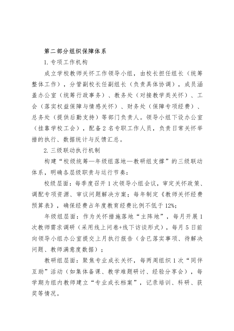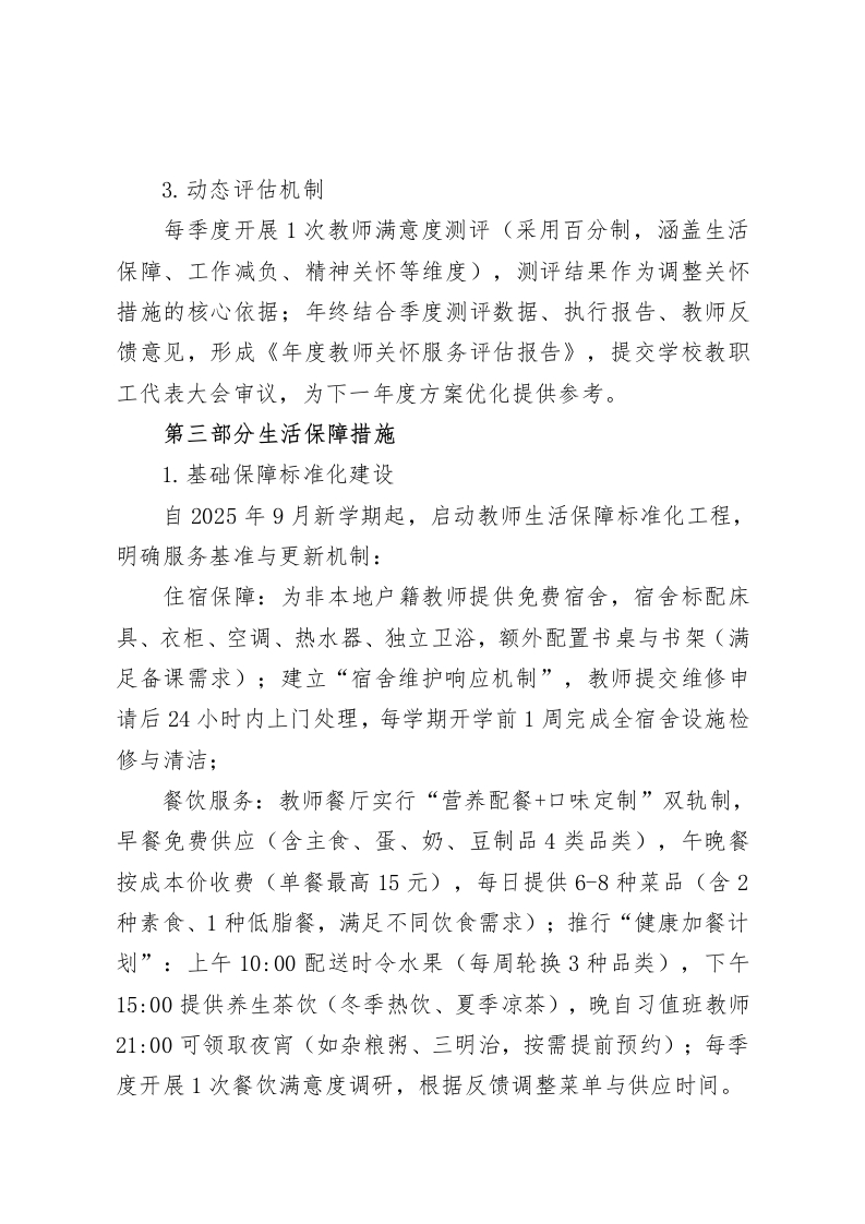 学校教师关怀服务实施方案(2025-2026学年)(完整版)第一部分指导思想与实施原则为深入落实立德树人根本任务,顺应教育高质量发展趋势,切实维护教师合法权益、激发教师职业活力,结合学校办学定位与教师队伍建设实际,特制定本方案。方案始终贯穿“以师为本、以德为先、以教为主”的核心理念,通过构建系统化、常态化的关怀体系,着力增强教师职业认同感、幸福感与归属感,为学校教育教学质量持续提升筑牢人才根基。实施原则聚焦四大维度:1.刚柔并济:以刚性管理制度保障教育教学质量基准,以柔性服务举措传递人文关怀温度,做到“严管”与“厚爱”并重;2.普惠与个性兼顾:覆盖全体教师饮食、住宿、健康等基础需求,针对孕产教师、重病教师、偏远地区任教教师等特殊群体,定制差异化关怀方案;3.当下与长远衔接:优先解决教师反映集中的“急难愁盼”问题(如通勤不便、负担过重),同步搭建长效保障机制(如职业发展通道、健康管理体系);4.物质与精神协同:在改善教师物质待遇的同时,强化职业价值引领与精神激励,实现“物质暖心”与“精神强心”双重效应。