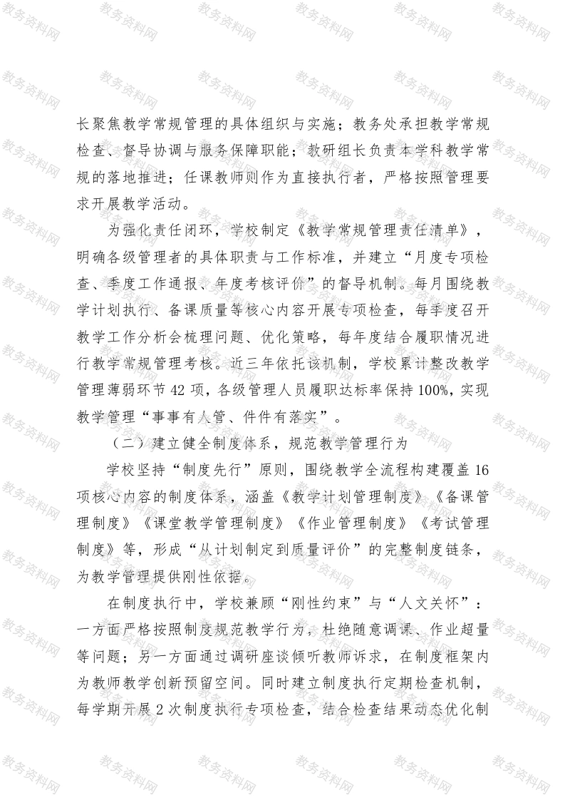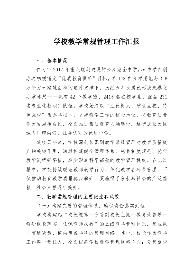 学校教学常规管理工作汇报一、基本情况作为市2017年重点规划建设的公办完全中学,xx中学自创办之初便锚定“优质教育供给”目标,在143亩办学用地与3.6万平方米建筑面积的硬件支撑下,历经五年发展已形成规模化办学格局一一现有42个教学班、2415名在校学生,配备231名专业化教职工队伍。学校始终以“立德树人、质量立校、特色强校”为办学根本,坚持教学工作的核心地位,将教育质量作为发展生命线,全面推进素质教育内涵建设,逐步成长为区域内口碑向好、社会认可的优质中学。建校五年来,学校深刻认识到教学常规管理对教育质量提升的关键作用,通过构建健全管理体系、完善制度规范、优化教学流程等举措,逐步形成科学高效的教学管理模式。在此过程中,学校持续规范教师教学行为、细化教学各环节管理,不仅推动教育教学质量稳步攀升,更赢得了家长与社会的广泛信赖,社会声誉逐年提升。二、教学常规管理的主要做法和成效(一)构建完善的管理体系,确保责任落实到位学校构建起“校长统筹一分管副校长主抓一教务处督导教研组长落实一任课教师执行”的五级教学管理体系,形成纵向贯通决策、横向覆盖学科的管理网络。其中,校长作为教学工作第一责任人,全面统筹学校教学管理战略方向;分管副校