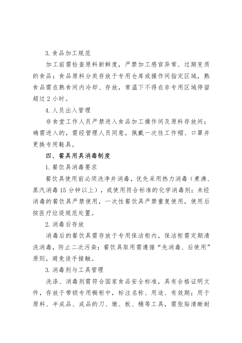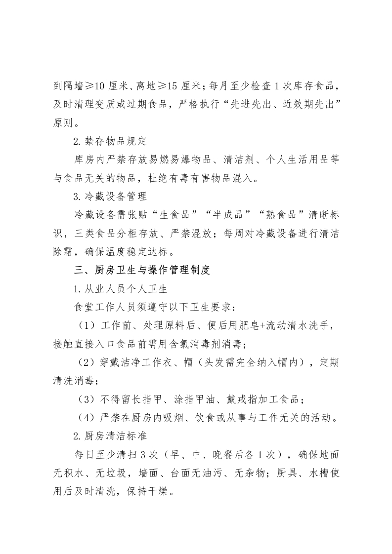 学校食堂卫生安全管理制度(2025修订版)一、原料采购与索证管理制度1.采购台账与财务公示建立并详实记录食品原料采购台账(含采购日期、供应商、品种、数量、价格等),每日在食堂财务收支公示栏公开原料采购清单及饭菜价格;食堂财务实行“日清月结”,每月至少公示1次收支明细。2.定点采购与资质查验采购员须到持有《食品经营许可证》的合规单位定点采购,采购时需查验供货方食品生产许可证、产品检验合格证明等资质材料(留存复印件备案),严禁采购以下食品:(1)腐败变质、油脂酸败、霉变生虫、污秽不洁、混有异物或有毒有害的食品;(2)未经兽医卫生检验或检验不合格的肉类及其制品;(3)其他不符合国家食品安全标准的食品。3.食品留样管理每餐每类食品需单独留样,每个品种留样量不少于150克,盛放于清洁密闭的专用容器中,标注食品名称、日期、餐次,在0-4℃冷藏条件下保存48小时,留样记录需专人保管备查。二、食品库房管理制度1.分类存放与效期管理食品按“生熟分开、荤素分离”原则分类、分架存放,做