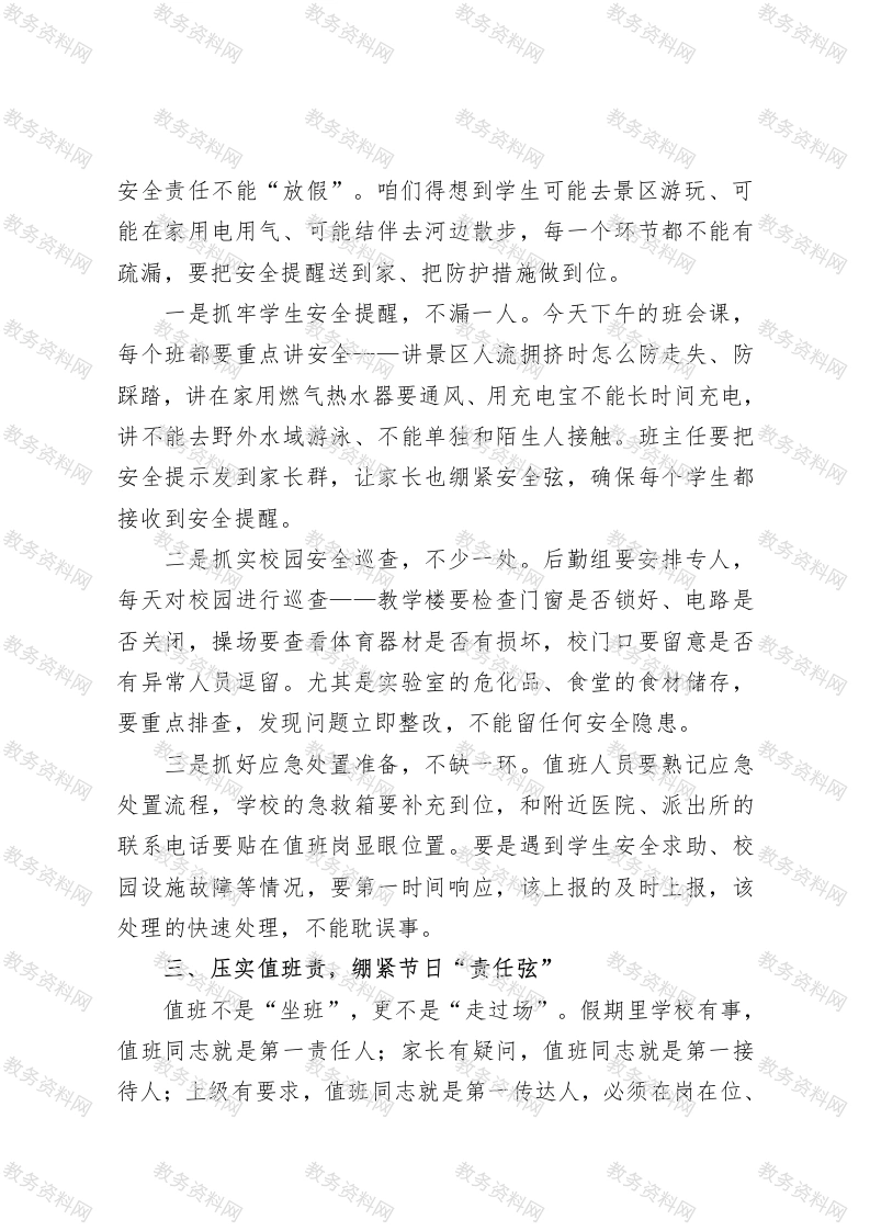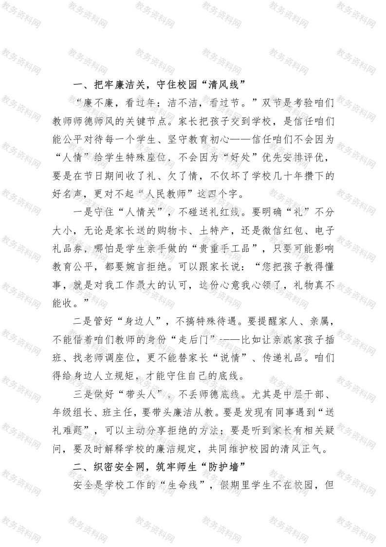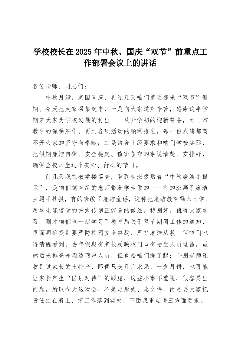 学校校长在2025年中秋、国庆“双节”前重点工作部署会议上的讲话各位老师、同志们:中秋月满,家国同庆,再过几天咱们就要迎来“双节”假期。今天把大家召集起来,一是向大家道声辛苦,感谢这半学期来大家为学校发展的付出一一从开学初的迎新筹备,到日常教学的深耕细作,再到各项活动的顺利推进,每一份成绩都离不开大家的坚守与奉献;二是结合上级要求和咱们学校实际,把假期廉洁自律、安全稳定、值班值守的事说清楚、安排好,确保全校师生过个安心、舒心的节日。前几天我在教学楼巡查,看到有班级贴着“中秋廉洁小提示”,是咱们德育组的老师带着学生做的一一有的班画了廉洁主题手抄报,有的班编了廉洁童谣,这种把廉洁教育融入日常、用学生能接受的方式传递正能量的做法,特别好,值得大家学习。刚才咱们也一起学习了教育局关于双节期间工作的通知,里面明确提到要严防校园安全事故、严抓廉洁从教。但咱们也得清醒看到,去年假期有家长反映校门口有陌生人员逗留,虽然后来排查是周边商户人员,但也给咱们提了醒;个别老师还收到过家长的土特产,即便只是几斤水果、一盒月饼,也可能让家长产生“区别对待”的顾虑,这些小事不重视,很容易出问题。所以今天这次会,不是走形式、念文件,而是要大家把责任扛在肩上,把工作落到实处,下面我重点讲三方面要求。