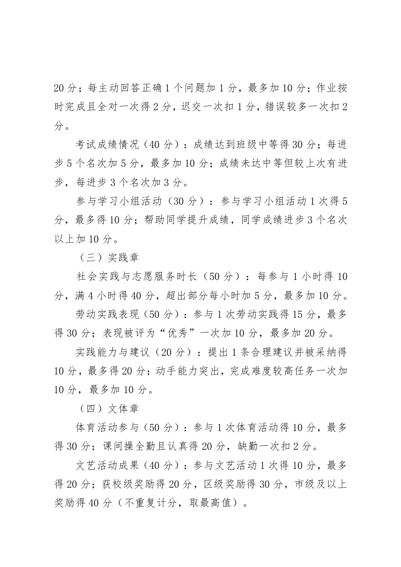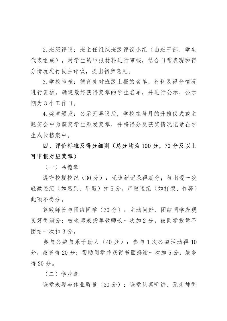 学校学生争章评价方案(含得分细则)一、评价目标通过争章活动,全面考察学生在品德修养、学业表现、实践能力、文体特长等方面的综合素养,激发学生的自我提升动力,促进学生德智体美劳全面发展。二、奖章设置(一)基础奖章品德章:评价学生遵守校规校纪、尊敬师长、团结同学、乐于助人等方面的表现。学业章:依据学生课堂参与度、作业完成质量、考试成绩进步情况等进行评定。实践章:考察学生参与社会实践、志愿服务、劳动实践等活动的时长与表现。文体章:针对学生在体育锻炼、文艺活动(如唱歌、绘画、舞蹈等)中的参与和成果进行评价。(二)特色奖章学校可结合办学特色和学生发展需求设置,如科技创新章、阅读达人章、环保卫士章等,鼓励学生发挥个性特长。三、评价流程1.个人申报:学生对照奖章评价标准及得分细则,在每月末自主申报符合条件的奖章,并提交相关证明材料(如实践活动记录、成绩单、获奖证书等)。