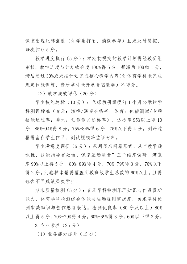 学校音体美教师考核办法(2025年修订版)一、考核宗旨与核心原则1.考核宗旨以“五育融合”为导向,全面落实立德树人根本任务,构建科学精准的音体美教师评价体系。通过考核精准衡量教师教学能力、专业素养与育人实效,激发教师工作主动性与创新力,推动美育、体育教学质量迭代升级,助力培养德智体美劳全面发展的时代新人。2.核心原则全程公开原则:考核标准、实施流程、评分依据及最终结果均面向全体教师公开。考核方案及细则需于考核启动前15个工作日公示,确保每位教师清晰知晓评价要求;考核过程需留存完整佐证材料(含教案、测评报告、活动台账等),评分细则需标注具体计分依据,结果公示期不少于5个工作日,公示期间受理异议申诉,且需在3个工作日内出具书面复核意见。科学适配原则:结合音体美学科实践性、审美性、竞技性特点,采用“定量60%+定性40%”的混合评价模式。定量指标聚焦可量化成果(如教学工作量、学生技能达标率、竞赛获奖数),定性指标侧重教师创新能力(如教学方法革新、课程设计创意)、育人态度(如师生互动质量、家校沟通成效),兼顾过程性成长与终结性成果。学科差异原则:针对音乐、体育、美术学科核心育人目标