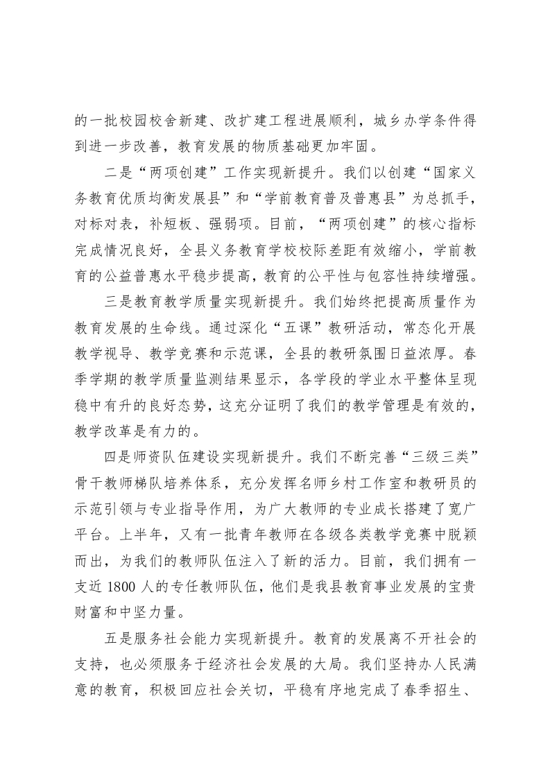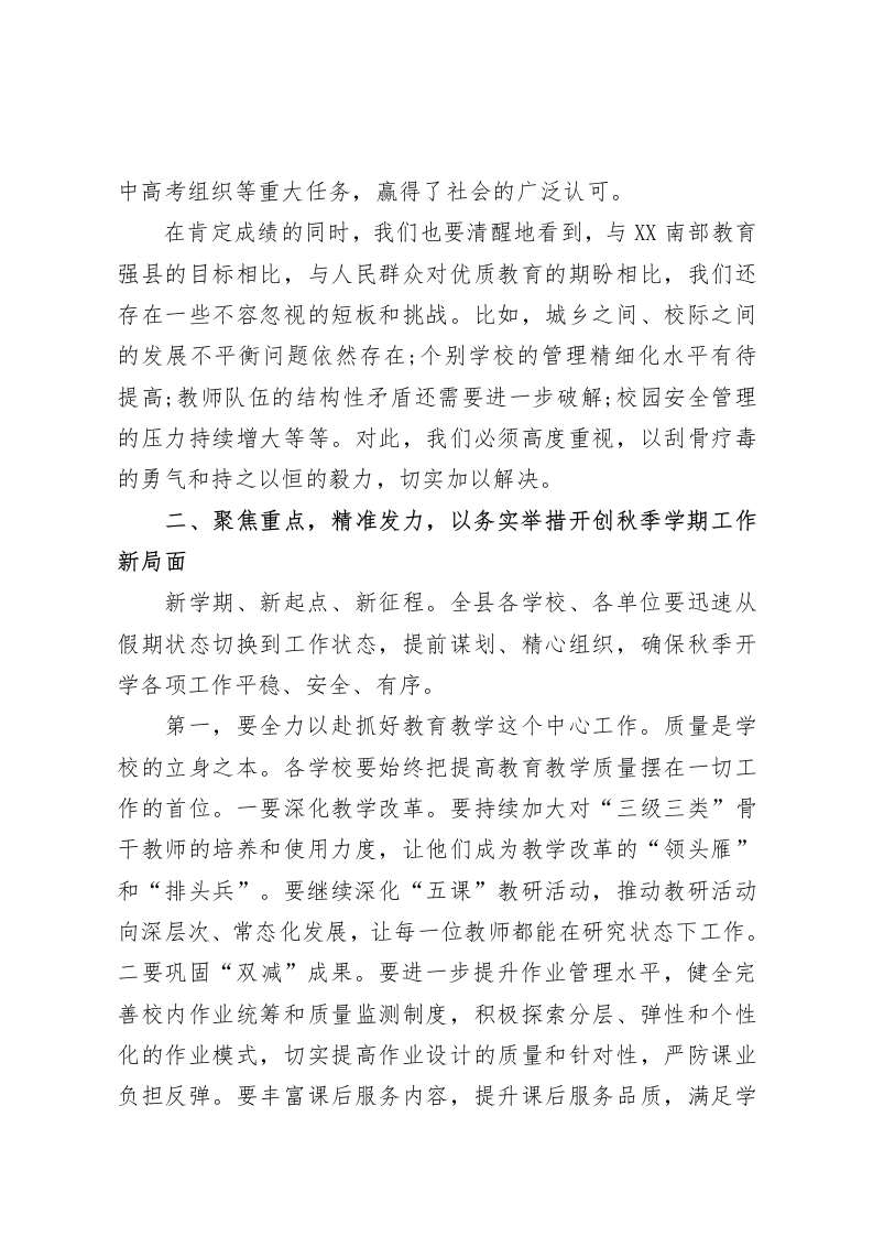 在XX县教体系统2025年秋季开学工作暨党风廉政建设会议上的讲话(精品)同志们今天,我们在这里召开全县教体系统2025年秋季开学工作暨党风廉政建设会议,主要任务是总结上半年工作,分析当前形势,全面部署新学期各项重点任务,并就进一步加强党风廉政建设进行再动员、再部署。这既是一次收心会,更是一次动员会、部署会。刚才,县教研室和县纪委监委驻教体局纪检监察组的负责同志分别就教学质量和党风廉政建设工作作了详尽的分析和安排,讲得都很好,我完全同意,希望大家认真领会,抓好落实。下面,我再讲三点意见。一、肯定成绩,正视挑战,在服务大局中坚定教育高质量发展的信心与决心今年是实施我县教育高质量发展“三年行动”的强基之年。半年来,在县委、县政府的坚强领导下,在全县广大教育工作者的共同奋斗下,我们紧紧围绕年度目标任务,攻坚克难,锐意进取,各项工作取得了显著成效,实现了“五大提升”,为全年目标的顺利完成奠定了坚实基础。一是教育投入与民生项目建设实现新提升。我们深知,教育是最大的民生。我们积极争取各方支持,持续加大教育投入。回顾2023年,全县教育经费总投入达到6.8亿元,同比增长20.1%,这一强劲势头在今年上半年得到了延续。我们统筹推进