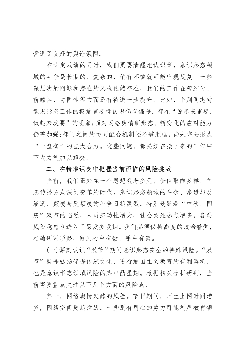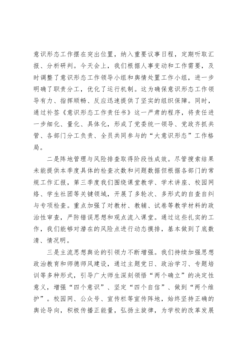 在XX中学2025年第三季度意识形态工作专题会议上的讲话(精品)同志们:今天,我们在此召开2025年第三季度意识形态工作专题会议,主要任务是深入学习贯彻上级关于意识形态工作的重要指示精神,系统总结我校第三季度的工作,精准研判当前面临的形势与挑战,并对下一阶段,特别是即将到来的“中秋、国庆”双节期间的重点工作进行周密部署。刚才,XX同志传达了上级会议精神并汇报了本季度工作情况,XX同志宣读了关于调整工作领导小组的通知,部分同志也补签了责任书。这些都为我们下一步工作的开展奠定了坚实的基础。意识形态工作是党的一项极端重要的工作,是为国家立心、为民族立魂的工作,直接关系到学校的办学方向、育人根本和校园的和谐稳定。在教育领域,意识形态阵地更是我们必须坚守、不容有失的核心阵地。下面,结合当前形势和学校实际,我讲三点意见。一、在复杂局面中巩固稳中向好的工作态势第三季度,面对纷繁复杂的内外部环境,全校上下能够始终绷紧意识形态安全这根弦,严格按照年初制定的工作要点和上级部署,主动作为、扎实工作,有效维护了校园的总体安全稳定,主流思想舆论持续巩固壮大。一是组织领导体系得到进一步强化。学校党委始终坚持把