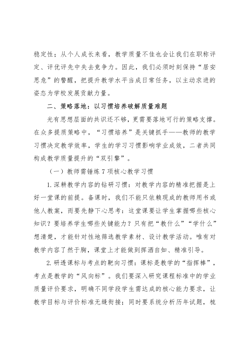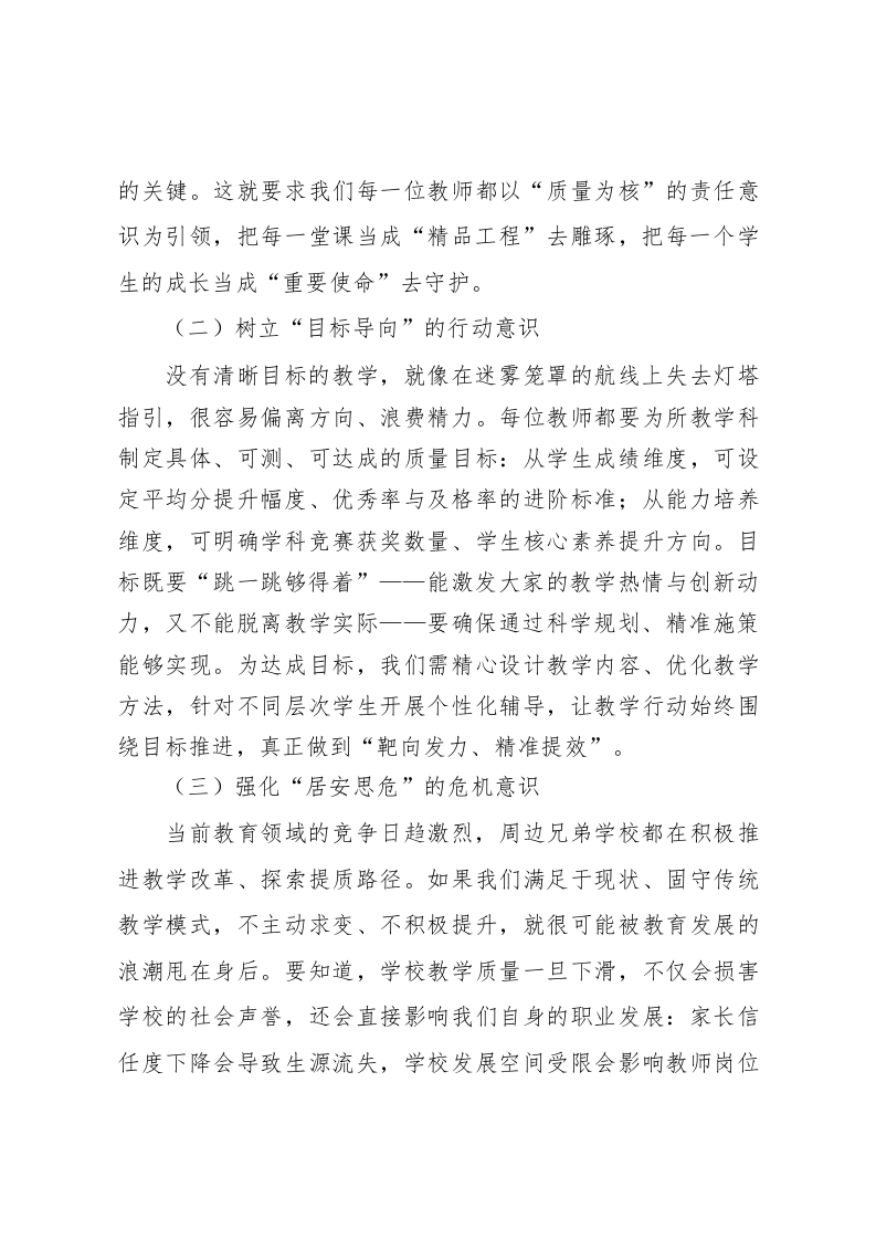 在教学质量提升动员会上的讲话(修订版)老师们:教学质量是学校发展的生命线,既承载着学校的生存根基与发展未来,更关系着我们每一位教师的职业价值与专业尊严。今天,我们齐聚一堂召开教学质量提升动员会,就是要统一思想共识、凝聚行动合力,用扎实可行的举措、坚定有力的步伐,推动我校教学质量实现全面跃升。一、思想筑基:以高度共识锚定质量方向思想是行动的“指南针”,若思想上缺乏重视,教学行动便会陷入被动,学校教学质量的提升也将沦为空谈。我们必须在思想层面形成高度共鸣,牢固树立三大意识,为教学质量提升筑牢根基。(一)树牢“质量为核”的责任意识教学质量不仅决定着学生的学业成长轨迹,更影响着教师的专业发展高度。一位深耕质量的教师,必然在学科领域积累深厚的知识储备、打磨精湛的教学技艺,也自然能赢得学生的信赖、家长的认可与同行的敬佩。从学校发展视角看,教学质量是学校最亮眼的“名片”一一优质的教学质量能吸引优质生源,能赢得社会各界的口碑,更是学校在教育竞争中站稳脚跟