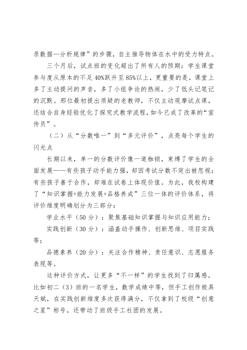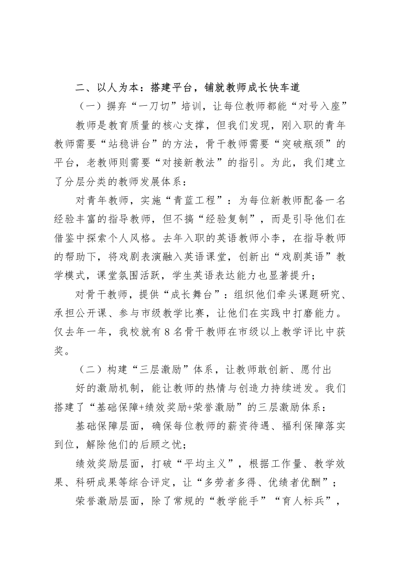 在教育质量提升经验交流会上,校长讲话:以变促教·以人为本·以质取胜尊敬的各位教育同仁、各位领导:大家好!今天能与各位相聚一堂,共探教育教学质量提升的核心议题,我深感荣幸。方才几位同仁的分享兼具深度与温度,既有理论思考,又有实践干货,令我深受启发。接下来,我愿以一名普通基层教育工作者的视角,分享我校在提升教育质量过程中的一些探索与尝试一一这些做法源于日常教学的摸索,或许不够成熟,却饱含着团队的心血,若能为大家提供些许参考,便已足够。一、以“变”促教:打破定式,探索教学模式新路径(一)从“被动灌输”到“主动探究”,激活课堂生命力传统填鸭式教学早已难以适配新时代学生的成长需求。去年秋季,我校启动课堂教学模式改革时,确实面临不少阻力。一位执教近三十年的老教师曾私下与我交流:“校长,我这样教了一辈子,学生成绩从没差过,何必非要改呢?”面对这样的困惑,我们没有选择“一刀切”的强制推进,而是选取6个班级作为试点,推行“问题引领一自主探究一合作交流一归纳升华”的教学新流程。以物理课“浮力原理”教学为例,教师不再直接讲授阿基米德定律,而是准备了烧杯、砝码、弹簧测力计等实验器材,让学生通过“称重一浸水一记