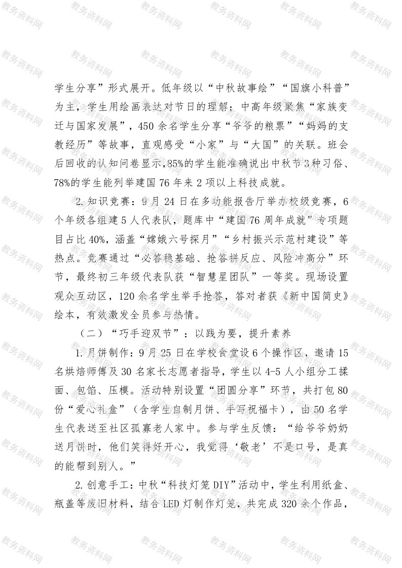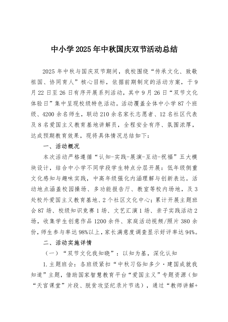中小学2025年中秋国庆双节活动总结2025年中秋与国庆双节期间,我校围绕“传承文化、致敬祖国、协同育人”核心目标,依据前期制定的活动方案,于9月22日至26日有序开展系列活动,其中9月26日“双节文化体验日”集中呈现校级特色活动。活动覆盖全体中小学87个班级、4200余名师生,联动210余名家长志愿者、12名社区代表及8名爱国主义教育基地讲解员,全程安全有序、氛围浓厚,达成预期教育效果,现将具体情况总结如下:一、活动概况本次活动严格遵循“认知-实践-展演-互动-祝福”五大模块设计,结合中小学不同学段学生特点分层开展:低年级侧重文化感知与趣味实践,中高年级强化内涵理解与创新表达。活动地点涵盖校园操场、多功能报告厅、教室等校内场地,及3处校外爱国主义教育基地、2个社区文化中心;累计开展主题班会87场、校级知识竞赛1场、文艺汇演1场、亲子实践活动2场,收集学生创意作品1200余件、家庭活动视频/照片380余份,师生参与率达98%以上,家长满意度调查显示好评率达94%。二、活动实施详情(一)“双节文化我知晓”:以知为基,深化认知1.主题班会:各班级紧扣“中秋习俗知多少·建国成就我知道”主题,借助国家智慧教育平台“爱国主义”专题资源(如“天宫课堂”片段、脱贫攻坚纪录片节选),通过“教师讲解+