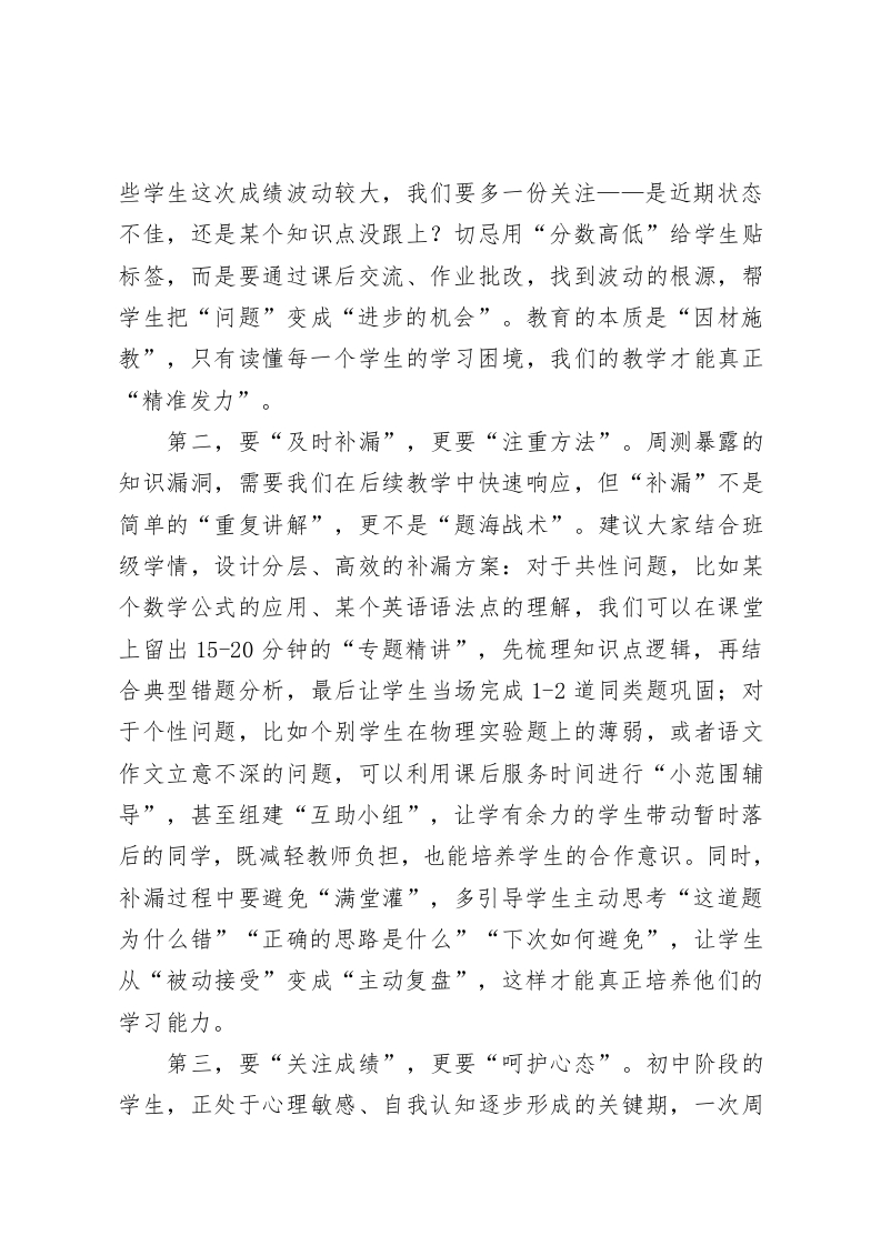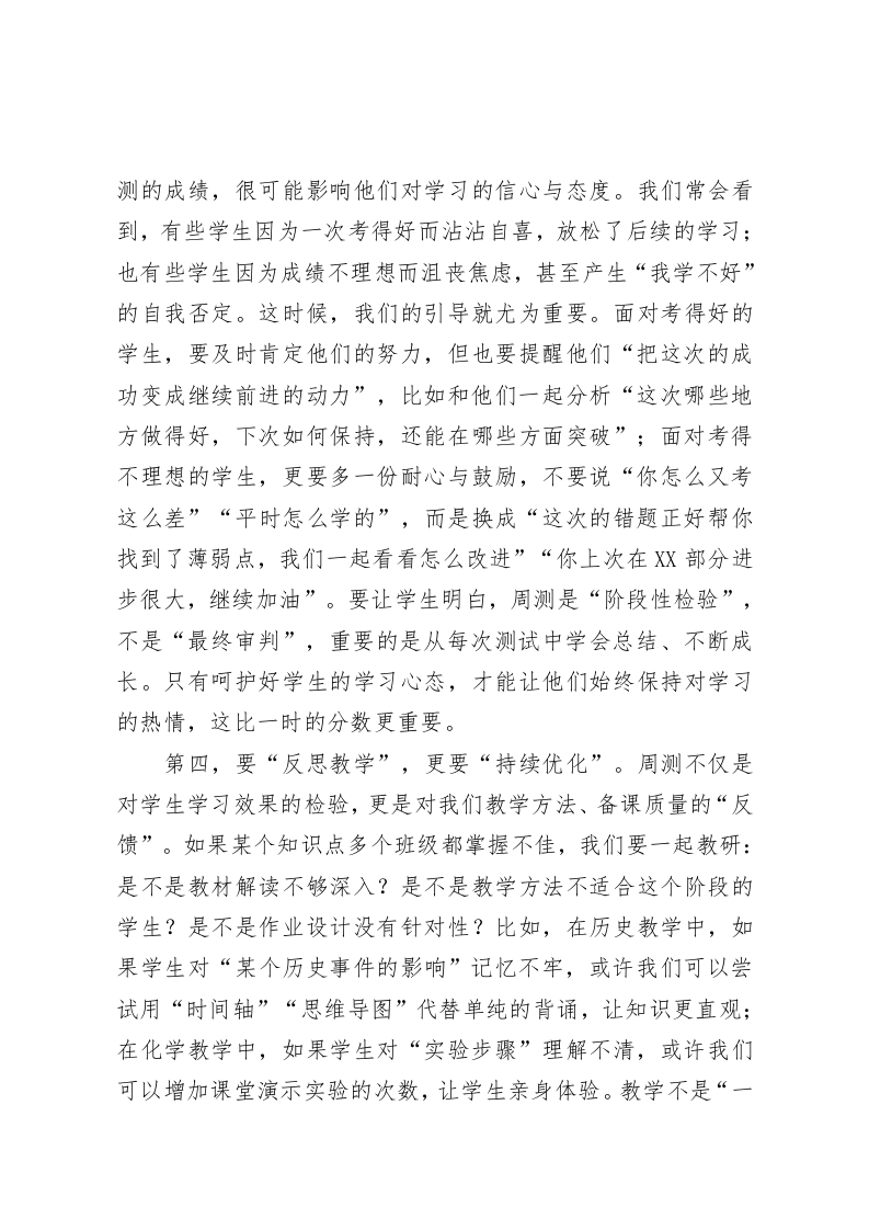 周测后,初中校长在全体教师会上的讲话:聚焦周测价值,深耕教学细节,共护学子稳步前行各位老师:大家好!本周的周测工作已圆满落幕,从考前的试卷命题、考场布置,到考中的严格监考、秩序维护,再到考后的流水阅卷、成绩统计,每一个环节都离不开大家的细心筹备与辛苦付出。在此,我代表学校向全体教师道一声:辛苦了!周测作为我校教学常规中的重要一环,本质是教学过程中的“诊断仪”与“导航标”,而非简单的“分数排序工具”。它的核心价值,在于帮我们精准捕捉教学中的优势与不足,为接下来的教学调整提供科学依据,更在于让学生及时发现知识漏洞、明确学习方向。今天,结合本次周测的整体情况,我想和大家分享几点思考与建议,也希望能和各位一起,把周测的价值真正落到实处。第一,要“深研数据”,更要“看见学生”。拿到成绩报表后,我们常会关注年级平均分、班级及格率、学科优秀率这些宏观数据,这能帮我们把握整体教学态势,但更重要的是“向下扎根”,关注数据背后的个体与细节。比如,某个班级的语文阅读理解题正确率偏低,我们不能只停留在“这部分没学好”的结论上,还要进一步分析:是学生对文章主旨的把握能力不足,还是答题思路不清晰?是我们讲解时侧重了理论而忽略了答题技巧,还是没有给学生足够的实战练习机会?再比如,有