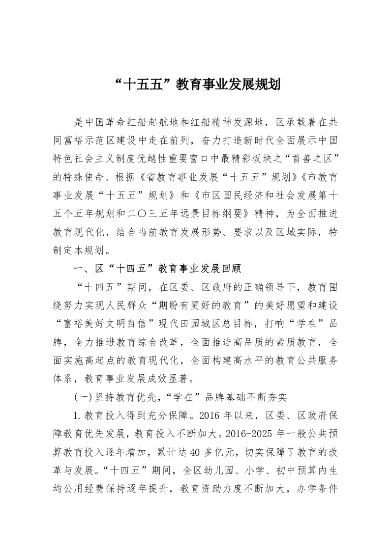 “十五五”教育事业发展规划是中国革命红船起航地和红船精神发源地,区承载着在共同富裕示范区建设中走在前列,奋力打造新时代全面展示中国特色社会主义制度优越性重要窗口中最精彩板块之“首善之区”的特殊使命。根据《省教育事业发展“十五五”规划》《市教育事业发展“十五五”规划》和《市区国民经济和社会发展第十五个五年规划和二O三五年远景目标纲要》精神,为全面推进教育现代化,结合当前教育发展形势、要求以及区域实际,特制定本规划。一、区“十四五”教育事业发展回顾“十四五”期间,在区委、区政府的正确领导下,教育围绕努力实现人民群众“期盼有更好的教育”的美好愿望和建设“富裕美好文明自信”现代田园城区总目标,打响“学在”品牌,全力推进教育综合改革,全面推进高品质的素质教育,全面实施高起点的教育现代化,全面构建高水平的教育公共服务体系,教育事业发展成效显著。(一)坚持教育优先,“学在”品牌基础不断夯实1.教育投入得到充分保障。2016年以来,区委、区政府保障教育优先发展,教育投入不断加大。2016-2025年一般公共预算教育投入逐年增加,累计达40多亿元,切实保障了教育的改革与发展。“十四五”期间,全区幼儿园、小学、初中预算内生均公用经费保持逐年提升,教育资助力度不断加大,办学条件