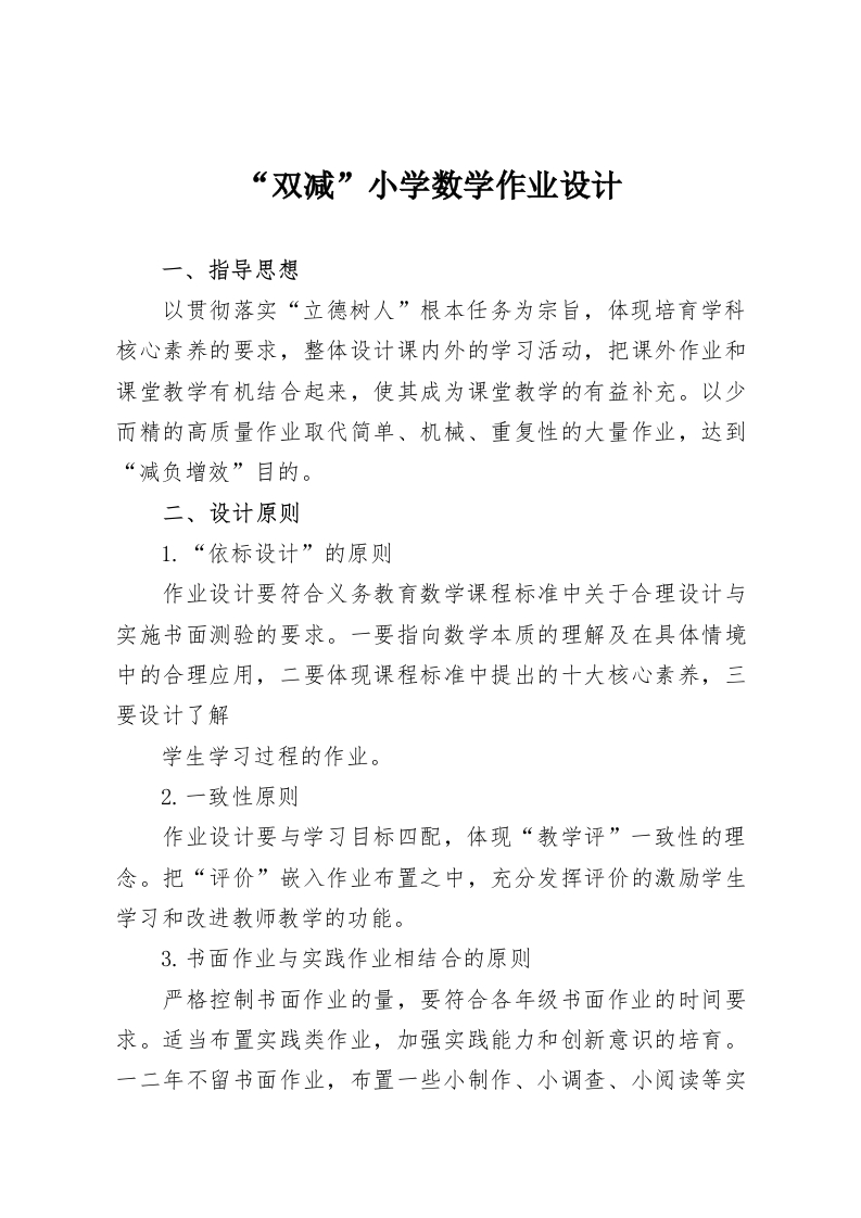 “双减”小学数学作业设计一、指导思想以贯彻落实“立德树人”根本任务为宗旨,体现培育学科核心素养的要求,整体设计课内外的学习活动,把课外作业和课堂教学有机结合起来,使其成为课堂教学的有益补充。以少而精的高质量作业取代简单、机械、重复性的大量作业,达到“减负增效”目的。二、设计原则1.“依标设计”的原则作业设计要符合义务教育数学课程标准中关于合理设计与实施书面测验的要求。一要指向数学本质的理解及在具体情境中的合理应用,二要体现课程标准中提出的十大核心素养,三要设计了解学生学习过程的作业。2.一致性原则作业设计要与学习目标四配,体现“教学评”一致性的理念。把“评价”嵌入作业布置之中,充分发挥评价的激励学生学习和改进教师教学的功能。3.书面作业与实践作业相结合的原则严格控制书面作业的量,要符合各年级书面作业的时间要求。适当布置实践类作业,加强实践能力和创新意识的培育。一二年不留书面作业,布置一些小制作、小调查、小阅读等实
