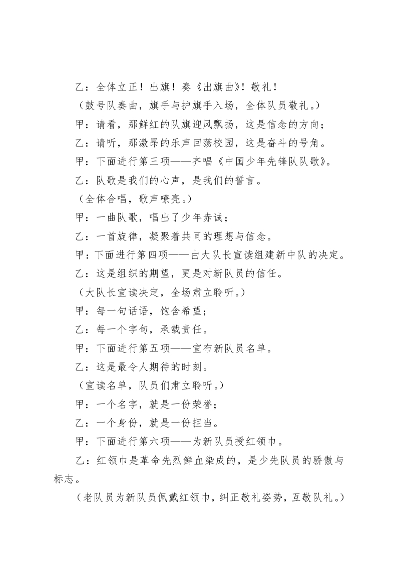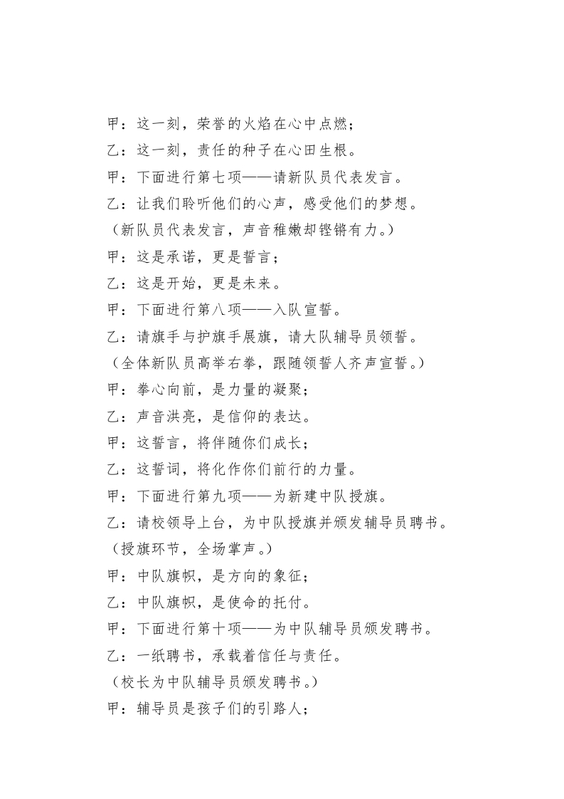 10.13建队日入队主持词一一强国复兴有我,争当新时代好少年甲:火红的队旗在晨风中飘扬,指引我们追逐梦想:乙:鲜艳的红领巾在胸前闪亮,激励我们勇敢前行。合:尊敬的老师们,亲爱的同学们,敬爱的家长朋友们,大家上午好!甲:今天,我们齐聚一堂,共同迎接2025年秋季建队日暨第二批新队员入队仪式。乙:这是一场光荣的盛典,这是一次庄严的教育,这是孩子们人生道路上的重要时刻。甲:在这里,他们将接过红色的旗帜,佩戴上鲜艳的红领巾,乙:在这里,他们将许下铿锵的誓言,开启全新的成长征程。合:现在,我宣布Xx小学2025年“强国复兴有我,争当新时代好少年”少先队第二批入队仪式,正式开始!甲:下面进行第一项一一集合整队。乙:请各中队辅导员向大队长报告人数。(辅导员逐一报告,大队长向大队辅导员汇报总人数。)甲:整齐的队伍,展现出少先队员昂扬的风貌;乙:洪亮的口号,传递出新时代少年坚定的力量。甲:下面进行第二项一一出旗仪式。