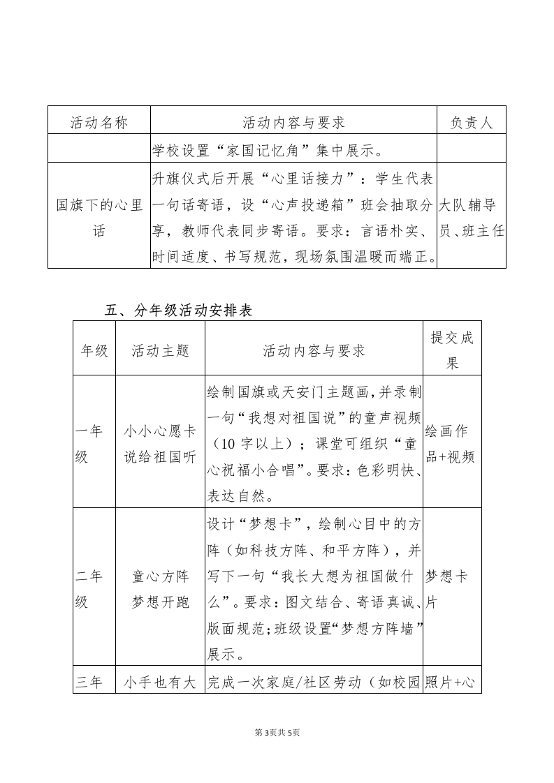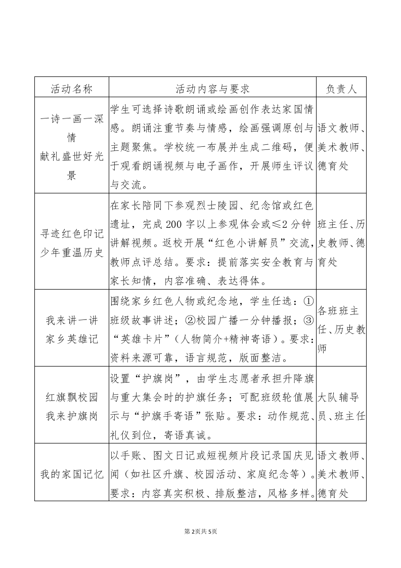 2025年国庆节活动方案七十六载春秋路,少年丹心映征途2025年是中华人民共和国成立七十六周年,也是中国人民抗日战争暨世界反法西斯战争胜利八十周年的纪念节点。回望来时路,是家与国同频、山与河同证的岁月坐标;面向新征程,是少年与时代相遇、理想与实践相融的成长起点。依托红色资源与身边故事,促进学生知史明理、崇德向善、珍惜和平。构建“仪式一实践一表达一展示”的闭环路径,学校拟开展“七十六载春秋路,少年丹心映征途”系列活动。一、活动主题七十六载春秋路,少年丹心映征途二、活动时间2025年9月20日一10月10日三、活动对象全体少先队员、全校师生四、全校性活动安排表活动名称活动内容与要求负责人举行升旗仪式,全体师生整齐列队、齐唱国歌,少先队员代表作《我与祖国共成长》主大队辅导五星映朝阳题发言。升旗后各班合唱国庆主题歌曲。要员、音乐教少年共起航求:统一着装(校服+红领巾),提前完成排师、班主任练与队列走位,秩序规范、氛围庄重。第1页共5页